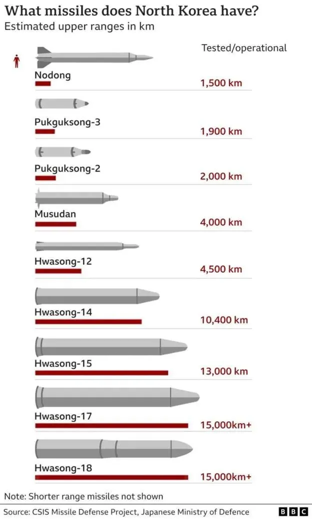 英国广播公司(BBC)12日特地配了一张图,描述朝鲜拥有的各种射程的**。BBC称,朝鲜在2022年测试了创纪录数量的**,其中包括能够打到美国领土的**。