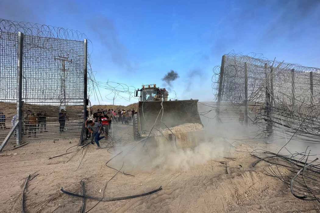 当地时间10月7日,哈马斯武装人员使用推土设备突破了加沙地带边界地区的围栏,1500多名武装人员涌入边境沿线的近30个地点。图自《纽约时报》