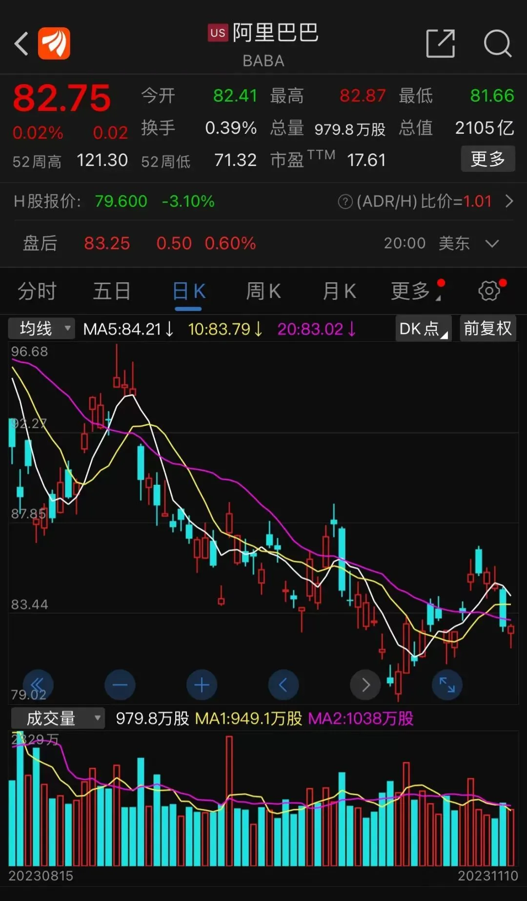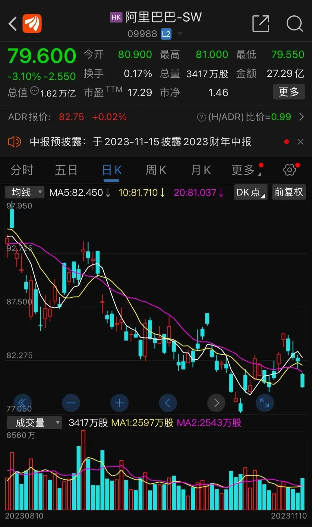 截至11月10日收盘,阿里巴巴港股股价报79.60港元/股,美股股价报82.75美元/股。