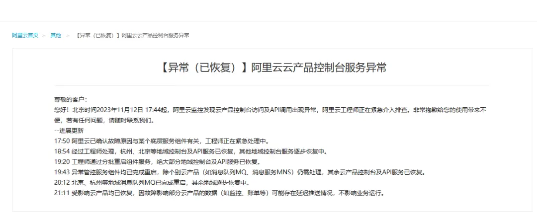 公告显示,北京时间11月12日17:44起,阿里云监控发现云产品控制台访问及API调用出现异常,阿里云工程师正在紧急介入排查。 19:20左右, 公告表示,工程师通过分批重启组件服务,绝大部分地域控制台服务已恢复访问。21:11时,公告称,受影响云产品均已恢复,因故障影响部分云产品的数据(如监控、账单等)可能存在延迟推送情况,不影响业务运行。