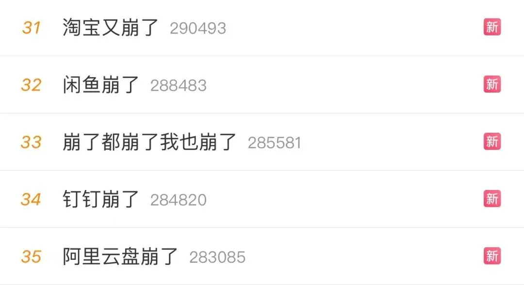 今日晚间,淘宝又崩了、闲鱼崩了、阿里云盘崩了、钉钉崩了等关键词登上了微博热搜,引发热议。