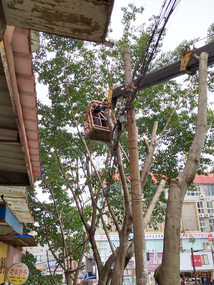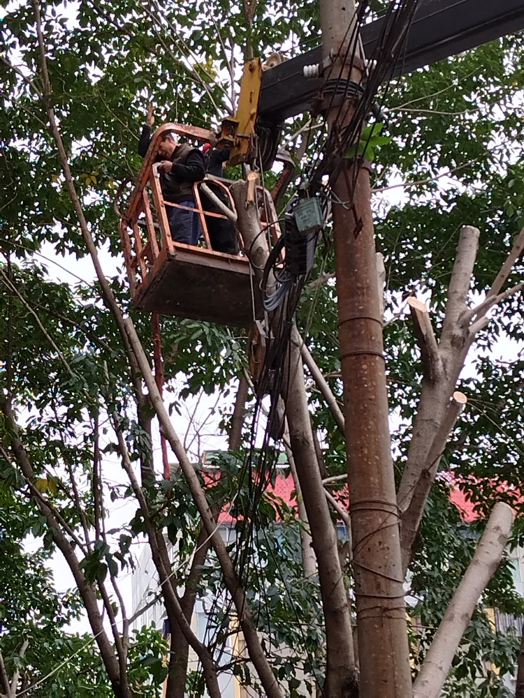 昨日下午,途经三台寺路,正好遇到新民街社区在清理树枝。抬头一望,两名工人在吊车篮里用电锯切割树枝,仔细看看,哦,两名工人都未系安全绳。