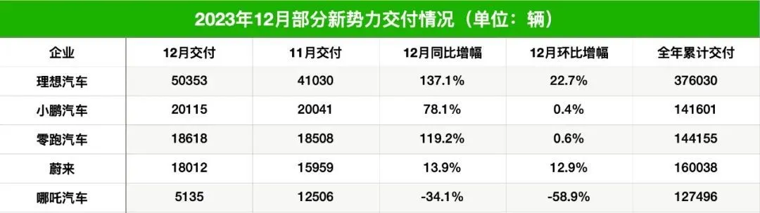 哪吒汽车在2023年12月仅交付5135辆新车,同比下滑34.1%,是当月唯一销量同比下滑的造车新势力。2023年全年,哪吒汽车共交付新车约12.7万辆,未能完成此前制定的25万辆的年度销售目标。