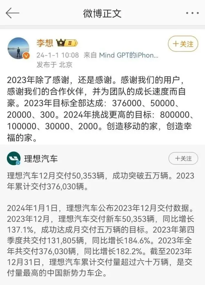 理想汽车董事长兼CEO李想在社交媒体发声:“2023年除了感谢,还是感谢。感谢我们的用户,感谢我们的合作伙伴,并为团队的成长速度而自豪。2023年目标全部达成。”