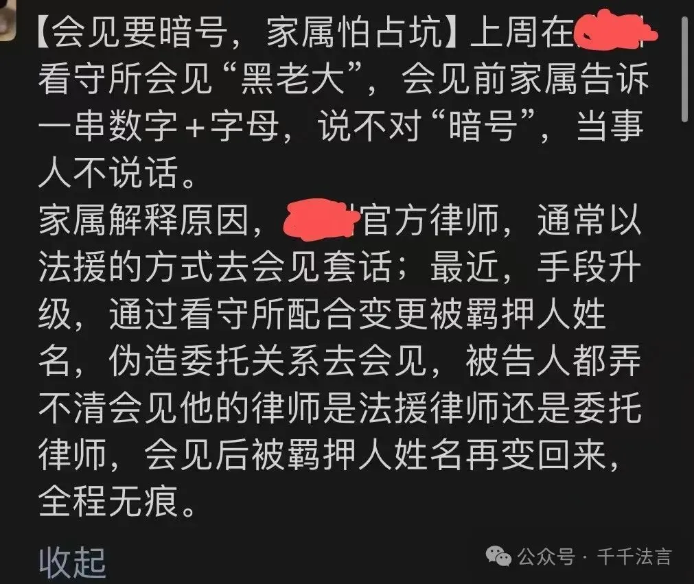 今天在微信群看到这样一张图片,图片内容是律师吐槽“会见要暗号,家属怕占坑”,说去看守所会见当事人前,家属告诉其一串数字+字母,说不对“暗号”,当事人不说话,原因是有官方律师,伪造委托关系去会见套话。
