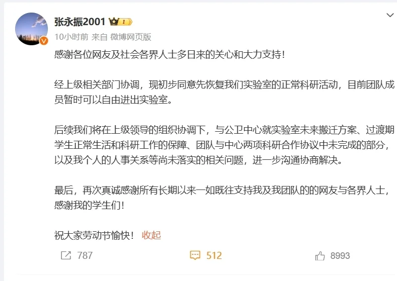 5月1日凌晨,张永振在微博发文称,经上级相关部门协调,现初步同意先恢复我们实验室的正常科研活动,目前团队成员暂时可以自由进出实验室。