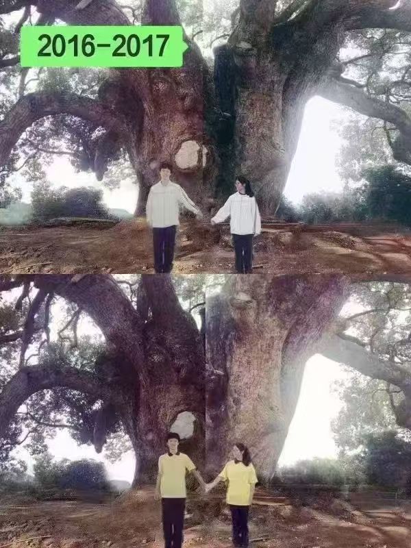 近日,湖南岳阳95后新娘李女士和新郎钟先生在家乡的千年古樟树下打卡留影,庆祝九年爱情长跑终修成正果。他们的故事发布在社交媒体后,立刻获得了大量网友的关注与祝福,截至目前已经有超过两百万的点赞。从校服到婚纱,他们一起经历异地、求学考博、工作,“同一个地方,同一棵树,还有没有改变的我们。我们自己都非常感动。” 10月15日,潇湘晨报记者联系到这对夫妻,听他们讲述了这段温暖陪伴的爱情故事。 18岁喜欢的人现在还在一起 二位新人告诉记者,他们是湖南岳阳平江人,2013年,在平江县第一中学相识,恋爱九年,今年6月9日领证,10月1日在老家一个酒店的户外草坪上举办了婚礼。新娘李女士介绍,“当天的心情是非常激动和紧张,看到了很多学生时代的一些同学朋友来祝福我们,感觉非常奇妙,就好像回到了平江一中,觉得一路走来也是十分不容易,也感到很幸福吧!”  钟先生和李女士今年国庆节在家乡举行婚礼 图/受访者供图 千年古樟树就像“证婚人” 据了解,在岳阳平江的青山绿水间,一棵千年古樟树静静伫立,已有2200余年的生命,树高逾30米,树干需六人合抱,遮天蔽日,浓荫覆盖数亩之地。这棵历经2200年风雨的古樟,是无数恋人的“证婚人”。 钟先生与李女士的故事便是其中动人的一章。“樟树被誉为风水树,有瑞祥之兆嘛。”李女士介绍,从青涩的校服到洁白的婚纱,他们每年都在树下合影。高考结束那年的夏天,他们在此许下每年都来此处合影的承诺,“所以它是肯定可以作为我们从年少到白发苍苍爱情历程的见证者,我们也希望我们的爱情可以像它一样长久地存在,所以我们之后还会每年都来这里拍照留恋记录。”          钟先生和李女士连续九年在家乡千年古樟树下合影 图/受访者供图 异地恋的坚守与成长 “我相信每个人的初恋都比较纯粹,都是奔着结婚去的吧。我先生是一个比较温柔的人,做事也很细心体贴,最主要的是他的性格非常适合我。”大学期间,两人分隔广州与岳阳,距离成为最大的矛盾。李女士透露,自己曾在焦虑中向钟先生倾诉思念,而钟先生二话不说,乘坐十几个小时硬座奔赴岳阳,用行动化解了她的不安。 异地恋的艰难并未击垮他们,反而让感情愈发坚韧。“明年是我们第十周年,我们已经想了一个很浪漫的仪式,想在古树下完成,这个就先保密吧!”2025年,他们终成眷属,李女士坚定表示,“认定对方是对的人,就要坚持。” 潇湘晨报记者朱天翔