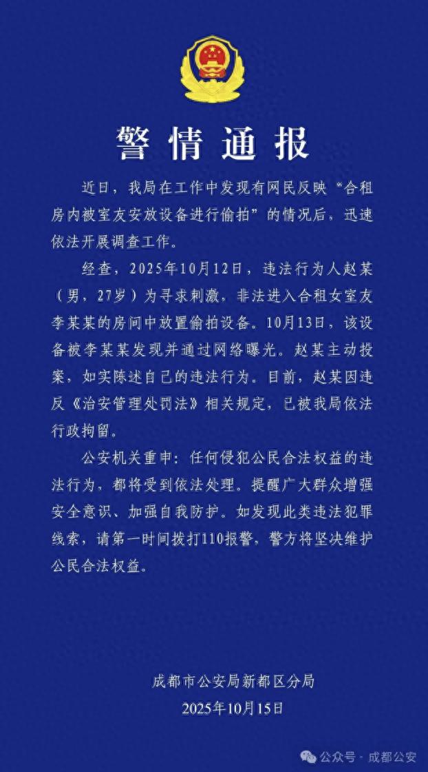 10月14日,四川成都一女性网友发视频称,其卧室被合租的一名男性室友藏匿录像设备、位置正对床头。15日,成都市公安局新都区分局就此事发布警情通报。