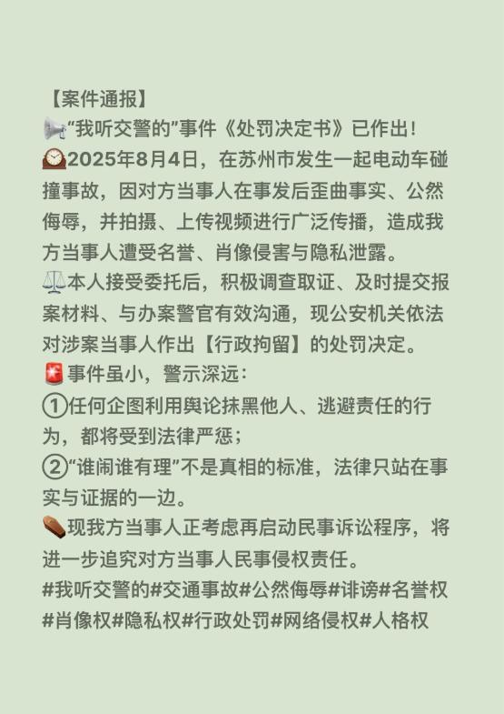 2025年10月15日晚,曾因“我听交警的”回应走红网络的苏州小伙,通过社交平台公布了公安机关的行政处罚决定书:涉事女子因公然侮辱、拍摄并传播未打码视频,导致小伙隐私泄露并遭受网络暴力,已被行政拘留。