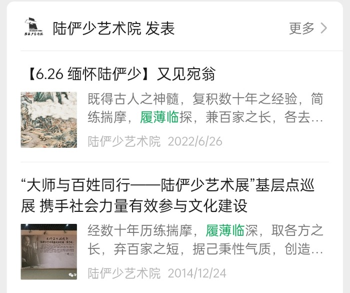 记者还注意到,在陆俨少艺术院官方微信公众号发布的文章中,同样存在这种用法不一的情况。从2014年2022年,该微信公众号有多篇文章在引用这段评价时,写的是“履薄临探”,但2014年12月24日发布的一篇文章中,却提到的是“履薄临深”。