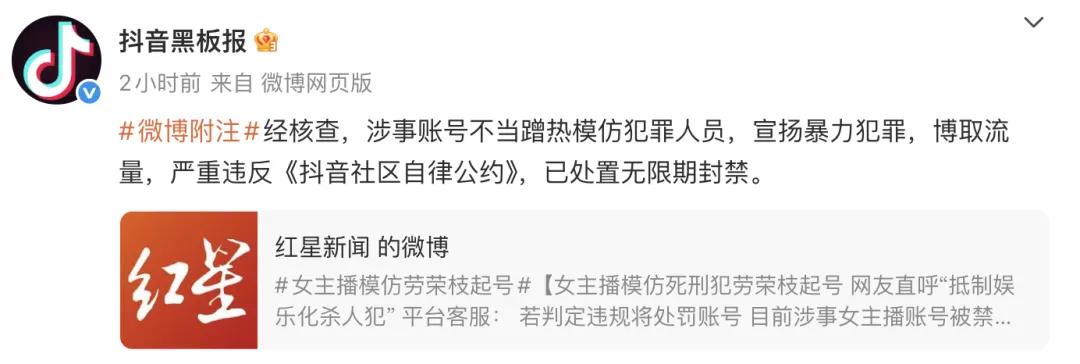 7日晚,抖音黑板报官方微博发文称,经核查,涉事账号不当蹭热模仿犯罪人员,宣扬暴力犯罪,博取流量,严重违反《抖音社区自律公约》,已处置无限期封禁。
