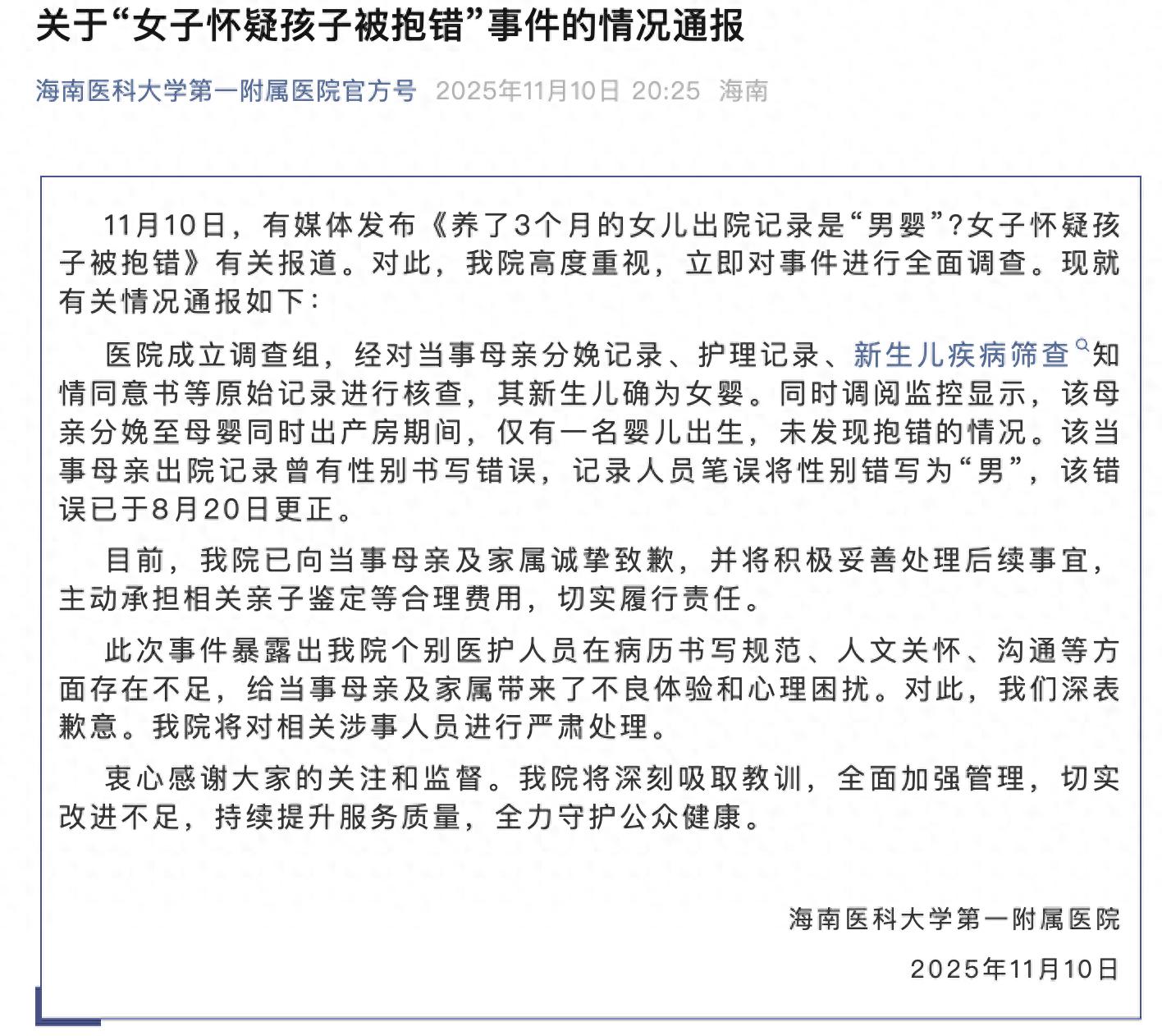 11月10日,海南医科大学第一附属医院发布情况通报: 11月10日,有媒体发布《养了3个月的女儿出院记录是“男婴”?女子怀疑孩子被抱错》有关报道。对此,我院高度重视,立即对事件进行全面调查。现就有关情况通报如下: 医院成立调查组,经对当事母亲分娩记录、护理记录、新生儿疾病筛查知情同意书等原始记录进行核查,其新生儿确为女婴。同时调阅监控显示,该母亲分娩至母婴同时出产房期间,仅有一名婴儿出生,未发现抱错的情况。该当事母亲出院记录曾有性别书写错误,记录人员笔误将性别错写为“男”,该错误已于8月20日更正。 目前,我院已向当事母亲及家属诚挚致歉,并将积极妥善处理后续事宜,主动承担相关亲子鉴定等合理费用,切实履行责任。 此次事件暴露出我院个别医护人员在病历书写规范、人文关怀、沟通等方面存在不足,给当事母亲及家属带来了不良体验和心理困扰。对此,我们深表歉意。我院将对相关涉事人员进行严肃处理。 衷心感谢大家的关注和监督。我院将深刻吸取教训,全面加强管理,切实改进不足,持续提升服务质量,全力守护公众健康。