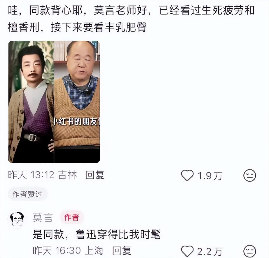 莫言在评论区回复不少网友的评论,引发热议。 对于被网友发现穿着鲁迅同款毛衣,莫言谦虚表示:“鲁迅穿得比我时髦”。莫言还回复了网友发布的余华夸他写书写得好的表情包,莫言称:“谢谢余华的夸奖,要是文明一点更好了”。