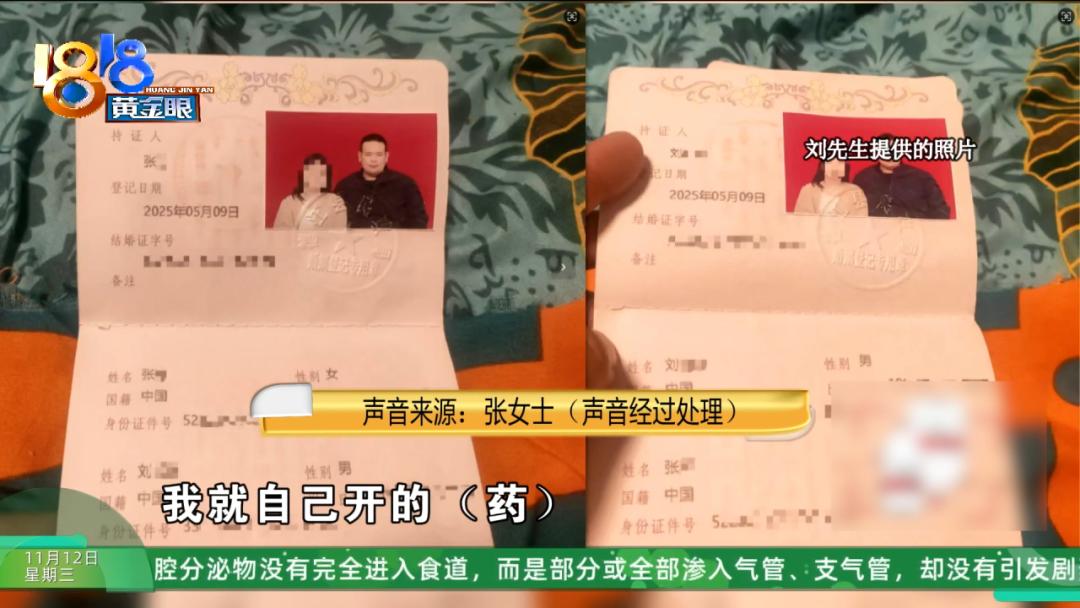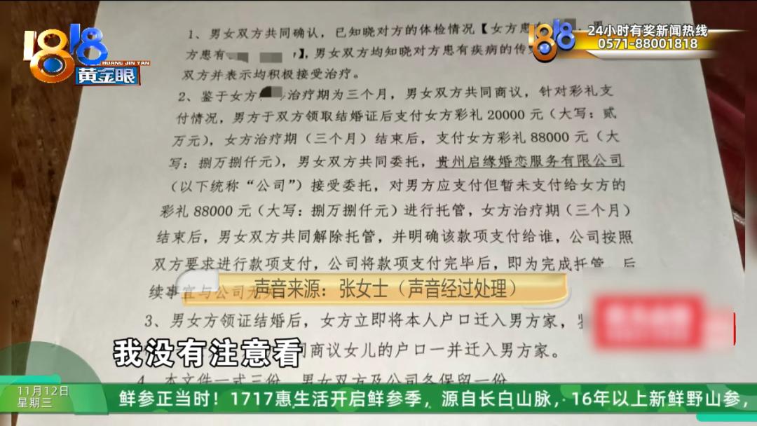 金华东阳的刘先生向记者反映:他跟婚介公司签了合同,5月份到贵州省相亲, 在那里他认识了一位张女士,第二天就领证了。 7月份妻子说要回老家考驾照,没想到一去不回。 刘先生的遭遇引发网友热议。  刘先生的遭遇上了热搜 跟着婚介去贵州 相亲次日就闪婚 刘先生出示了一张《定金协议》的照片,他说3月11号向金华的东阳市闪爱婚恋服务有限公司交了2万元定金,支付记录显示,钱打到一个叫“囍大人”的账号商户全称为“东阳千喜信息咨询工作室”。  刘先生说,这两万元的定金包含了5月5号他和母亲两人飞往贵州的机票钱以及在贵州的住宿、用餐、制作相亲资料等费用,5月8号他见到了张女士,5月9号两人就领了结婚证。 记者:这个女的是有什么很让你心动的地方吗? 刘先生:没有。我妈她是这样说的,她说可以的话就答应这门婚事了。 记者:这女的哪让你心动,或者怎么样?为什么会马上就结呢? 刘先生:我妈,我妈她是这样说的,她说反正随便,不管怎么样,隔壁邻居看到了不行,她说随便搞一个走就行了。 刘先生的母亲:她长得还可以,这个人就还漂亮的。 记者:你觉得漂亮吗? 刘先生:我感觉没什么太大…… 记者:那结婚是你的事情,你就结了呀? 刘先生的母亲:我看到这个人是很漂亮的。 刘先生出示了《婚恋平台服务合同》、《婚前合同》、男女双方的《婚恋保障服务合同》等材料,涉及到浙江和贵州的多家公司,约定了多笔数额不等的婚介费以及给女方的彩礼金额。 刘先生说合同金额总数是358000元,包含了给女方的108000元彩礼,《婚恋保障服务合同》里跟他们夫妻有约定,彩礼会按照相应的时间点,分批支付给女方本人。   5月12号,小两口跟母亲一起回到金华东阳。刘先生家手写了一份账单,罗列出这次相亲结婚的所用花费包含婚前的婚介费、彩礼费、酒席红包等合计421550元。婚后给女方的生活费等其它开销合计31220元。这里面还有9000元是刘先生母亲在7月2号转给儿媳妇回老家学车的钱。  可让刘先生和他母亲意想不到的是,张女士回去后就失联了。 刘先生:她说回去学车了,就不回来了。女方就是在推嘛,红娘也在推,公司也在推,现在是都推责任嘛。 记者:她不回来是因为你们吵架了,打架了? 刘先生:没有。 刘先生的母亲:没有。开开心心地走的。  记者请刘先生联系他的妻子,电话没有接通,聊天记录显示两口子还一直在沟通,但并不愉快。   不回来有“隐情” 协议提到“病情” 金华东阳市囍橙婚恋现场负责人刘女士表示:据她了解,张女士回老家是得到刘先生一家同意和支持的。两口子在东阳这段时间,没有发生过打架和大的争吵,但关系算不上好。  婚介公司的刘女士表示他们会再联系张女士,从他们之前掌握的情况判断,此事另有隐情。  金华东阳市囍橙婚恋现场负责人 刘女士:他自己本身有点原因,他们夫妻之间就是还不能那个啊,那我们叫他把自己先做好。 但刘先生表示自己已经康复。 刘先生拿出了一份《情况告知确认及补充协议》,说是5月8号跟妻子相亲后贵州的婚介公司让他们双方签署的协议第一条就是“男女双方共同确认已知晓对方的体检状况以及疾病的传染性情况等,双方均表示积极接受治疗”   记者:结婚没感觉还有隐疾,只想以后马上抱孙子是吧? 刘先生:我妈太急了,基本上都是我妈太急了。 记者:你也准备马上要她抱孙子? 刘先生:我想成个家,就是这样子。   《情况告知确认及补充协议》里的第二条约定:“鉴于女方治疗期为三个月,男女双方共同商议,男方于领取结婚证后支付女方彩礼两万元,治疗期三个月结束后支付8万8千元。在此期间,男女双方共同委托婚介公司托管这笔8万8的彩礼费用。” 刘先生的母亲认为儿媳妇三个月治疗期还没到,就先回老家学车也存在先拖时间再取走剩余彩礼的心思。  与此同时,刘先生通过朋友试探,发现女方疑似另寻对象。这让刘先生更怀疑张女士是在骗婚。  妻子回应争议 列举婚后种种 对此记者给张女士发去了短信核实张女士回了电话,但首先提到的还是双方的病情。 张女士:在相亲公司是说好的,我看病的那些费用全部他们出。但是那个费用最后他们没有给我。  张女士说对于夫妻之间的一些话题,她当时不太能接受。   张女士:本来相亲的时候,他那个病情不是说他没有传染性吗?结果去医院检查,他有传染性。当时我这个也有病,但是他们是清楚的,我在治疗。 刘先生:那女方有心脏病都没说,都是后面她妈跟我说的。女方有心脏病,你气她的话,心脏病会发作。 张女士:那生孩子要等病情好了才可以生啊,对不对?你不可能病情还没好,你就生个小孩。  张女士觉得丈夫没有积极配合治疗调养,却跟婆婆一样只想尽快生小孩,让她非常没有安全感,而且5月份到东阳后,她也多次向婚介公司反映过婆家的生活习惯和卫生状况。  她同时强调之前一个多月的共同生活中,最让她难以接受的是丈夫隐瞒了自己辞职的情况。 金华东阳市囍橙婚恋现场负责人 刘女士:一段时间都没有好好工作。那女生在这里的时候,他们俩就是他妈妈去工作,他们俩天天在家里玩。 张女士觉得丈夫工作上不够努力,刘先生一家却觉得妻子生活上不够勤劳。  刘先生母亲表示:张女士只烧了晚饭,其他事不做,也不去上班,晚上两点睡觉,下午三点起床。 张女士则称:领了结婚证之后我说,我要去我以前那里上班,他说不用,你辞职之