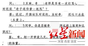 耿女士孩子被揪耳朵前后(左图为被揪后)对比 受访者供图 11月12日,耿女士告诉红星新闻记者,此事已在当地人民法院开庭,在法庭上耿女士拿出了自己手里的证据,而班主任李老师和学校方对其控诉予以否认。 在耿女士提供的资料中,学校曾成立联合调查组进行调查。调查中,学生在笔录中提到,李老师曾对耿女士儿子进行过朝头上吐口水、辱骂“臭狗屎”、揪耳朵等行为。 11月13日,红星新闻记者联系时任班主任老师李某兵,但其未接电话。学校负责人则回复,现已经开庭,一切以法院判决为准。 家长控诉: 孩子患心理疾病,已休学 近日,耿女士在红星新闻爆料平台留言,称自己的孩子在云南省富源县一所中学读初一年级时,受到班主任李老师长期当众脚踢、揪耳朵、辱骂,甚至被“吐口水”在头上……孩子已经休学不敢上学。 11月12日,红星新闻记者联系上耿女士,她正在云南省富源县人民法院开庭。 据耿女士讲述,从2021年10月起,刚上初一的孩子突然在家里情绪爆发,踢打自己。通过询问,孩子称班主任李老师就是这样对待自己的。同时,耿女士还发现孩子身上有伤。在孩子爸爸和李老师沟通后,当年10月14日,孩子又被班主任李老师揪耳朵发肿,回家后问她要冰块敷耳朵。之后,耿女士注意到,孩子经常出现情绪异常波动。 耿女士承认,自己的孩子有多动的情况,小学成绩不是特别理想。但耿女士表示,孩子学习不积极,不能每天都踢打孩子,给孩子造成心理压力。 2021年11月,耿女士得知孩子因跑操再次被李老师踢小腿,“还当着全班骂孩子是臭狗屎,喊大家不要理他”。随后,孩子爸爸找班主任理论,未果。 耿女士回忆,2021年12月24日,孩子回到家里吵着要跳楼,说李老师故意针对他,随后未上学。到2022年1月的期末考试时,“听说孩子被李老师喊到办公室,考试时在考场上发生呕吐”。回家后,耿女士发现孩子精神状态不好,再次吵着要去跳楼,每天在家呕吐四五次。 此时,耿女士才发现问题的严重性,怀疑孩子一直在班上被李老师故意针对出现问题。耿女士找到学校要监控,“学校以监控只保存7天为由,没有提供”,耿女士说。 耿女士将孩子带到昆明医科大学第一附属医院看病,诊断证明书显示,孩子患上:“1.应激性 恐怖性焦虑障碍;2.应激性 混合性焦虑和抑郁障碍;3.创伤后应激障碍”。  诊断证明书 受访者供图 通过药物治疗后,孩子情况有所好转。 2022年春节过后,当孩子3月再次上学后,病情出现不稳定情况,轻微批评一下紧张得发抖,全身冒汗,上课发生呕吐。1个月后,因孩子情况影响到教学,耿女士给孩子选择休学。 学校调查: 出现违反教师职业道德规范的行为 红星新闻记者从耿女士提供的资料中发现,2024年6月15日,该中学曾成立联合调查组,对耿女士反映李老师体罚学生的问题出具了《初核报告》(以下称《报告》)。 在调查笔录中,有学生说李老师在班上喊耿女士儿子“臭狗屎”,并有学生跟着喊。此外,班上学生承认李老师还针对其写打油诗:“这个小子本无才,你老子硬要送来,到时候试卷交上去,鸭蛋滚下来。” 班上同学讲述,李老师在一次升旗站队时,打骂耿女士儿子说“老子连你爹一起甩”。学生还称,当时李老师还吐口水在耿女士儿子头发上。   调查笔录 受访者供图 《报告》的第二部分“发现的主要问题及初核结果”内容中提到,联合调查组对班上25名学生展开调查,其中,5名同学反映班主任李老师教育耿女士孩子时语言上存在过激行为,1人反映有揪耳朵的现象。 《报告》还载明,耿女士丈夫为了解孩子的状况,曾宴请班主任李老师及部分科任老师,其中1位老师去过,有3位老师称被喊过但没有去。李老师在接受调查时承认,因为耿女士丈夫和李老师是同事关系,也互请过。耿女士称,自己丈夫和李老师并无仇恨,在孩子读书之前双方作为同事并无过多交集,偶尔见面打个招呼。 最后,学校联合调查组通过专题会议讨论研究,认为李老师在班级管理过程中,出现违反教师职业道德规范的行为,鉴于调查材料不足,缺乏事实支撑,依据教育部2018年修订的《中小学教师违反职业道德行为处理办法》第三条第二款、第四条第(九)项之规定,决定对李老师的违纪行为“建议作出批评教育处理”。 起诉后现已开庭 学校回复:一切以法院判决为准 从2021年到2024年,耿女士的儿子因健康问题休学,并一直在接受治疗。 2024年9月,耿女士以儿子的生命权、身体权、健康权为由,将李老师和学校起诉至云南省富源县人民法院。针对儿子的病情,耿女士表示,目前面临困难,无法找到合适的鉴定机构进行司法鉴定。  法院传票 受访者供图 在11月12日的庭审中,耿女士提交了相关证据,包括与李老师的聊天记录。她表示,在法庭上,李老师和学校方面均否认了对她儿子进行踢打、揪耳朵及辱骂“臭狗屎”等行为的指控。 11月13日,红星新闻记者联系李老师,但其未接电话。随后记者拨打了学校负责人电话,其回复,12日刚开庭,不方便介绍情况,“一切以法院判决为准”。 红星新闻记者 张杨 编辑 欧鹏 审核 高升祥