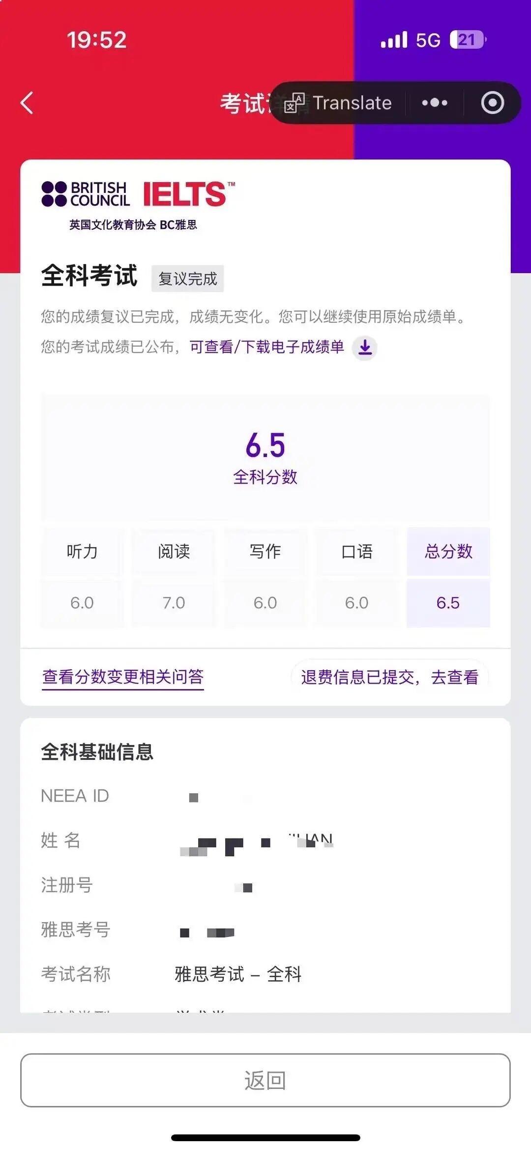 记者联系到受影响考生任先生,他告诉记者自己参加的是今年8月的雅思考试,是准备申请墨尔本大学的留学项目,该校入学对雅思小分要求为6分、总分要求6.5分。“考完大概两个月后,我收到了雅思主办方的邮件,说成绩有误,涉及阅读环节。”任先生表示,原本的阅读成绩是6.5分,更正后提升至7分,这让他的总分从6分达标至6.5分,完全满足学校的语言要求。