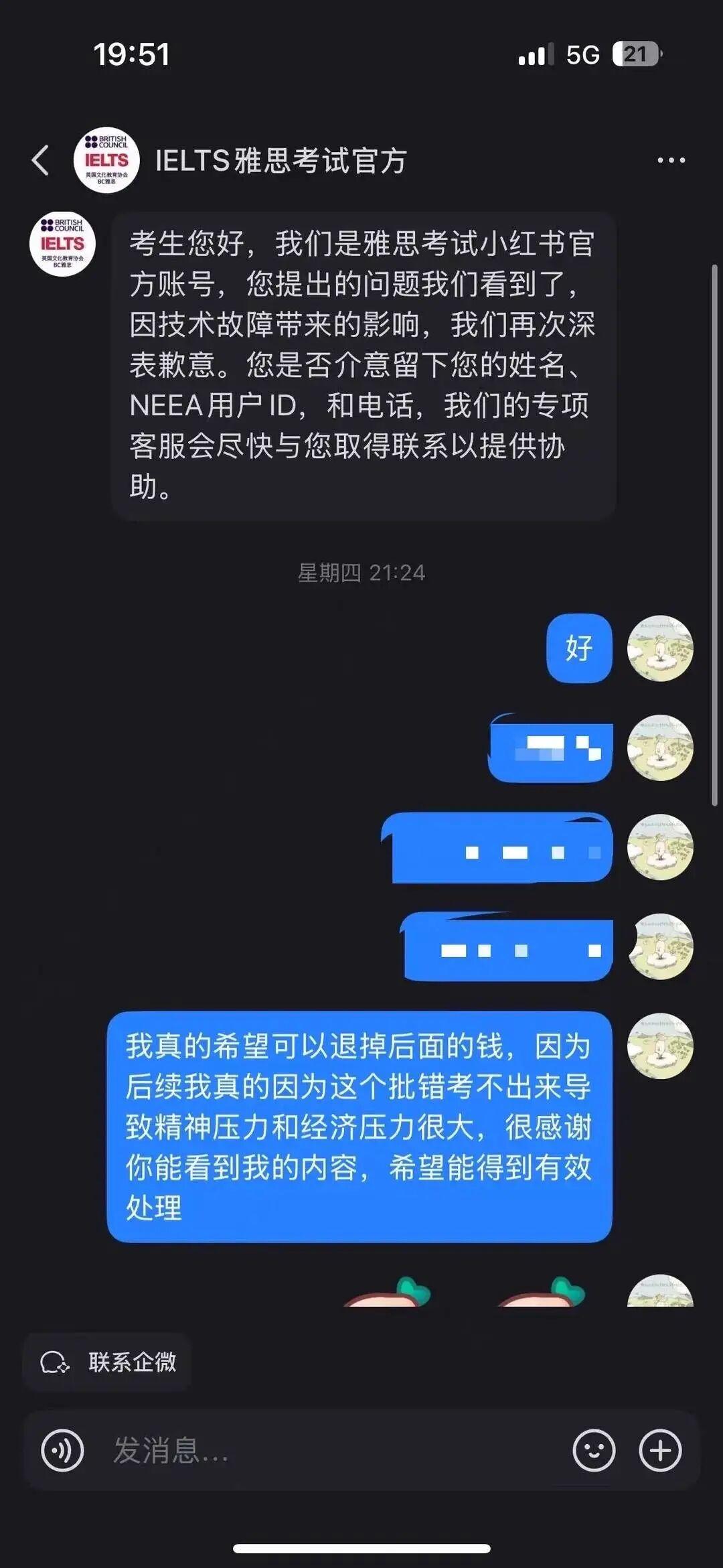 为了争取合理补偿,任先生曾尝试联系雅思官方。“上周,小红书的雅思官方私信我,说看到了我发的帖子,让我留下姓名、考试ID和电话,说会跟我取得联系,但我至今没收到任何电话。”任先生表示,官方提供了一个投诉邮件地址,让他发邮件反馈,“网上跟我经历相似的人太多了,有些人甚至因为雅思成绩问题改变了人生轨迹。”