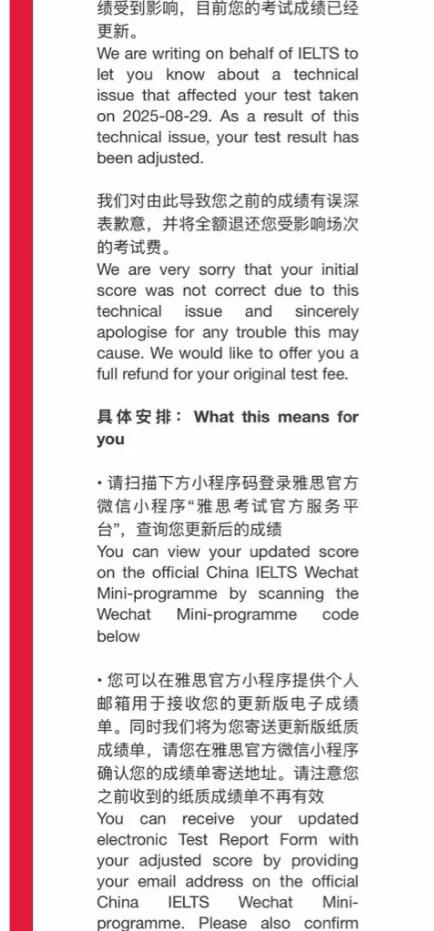 近日,陆续有网友在社交平台发帖称,收到雅思主办方的邮件通知。通知中提到:由于技术故障导致此前参加的雅思考试成绩受到影响,目前考试成绩已经更新。对由此导致之前的成绩有误深表歉意,并将全额退还受影响场次的考试费。考生可以在雅思官方小程序提供个人邮箱用于接收更新版电子成绩单。同时将寄送更新版纸质成绩单,可在雅思官方微信小程序确认成绩单寄送地址。并提示之前收到的纸质成绩单不再有效。考生可在2026年5月1日前登录雅思官方微信小程序办理全额退费,预计退费在提供准确银行信息后30个工作日内到账。
