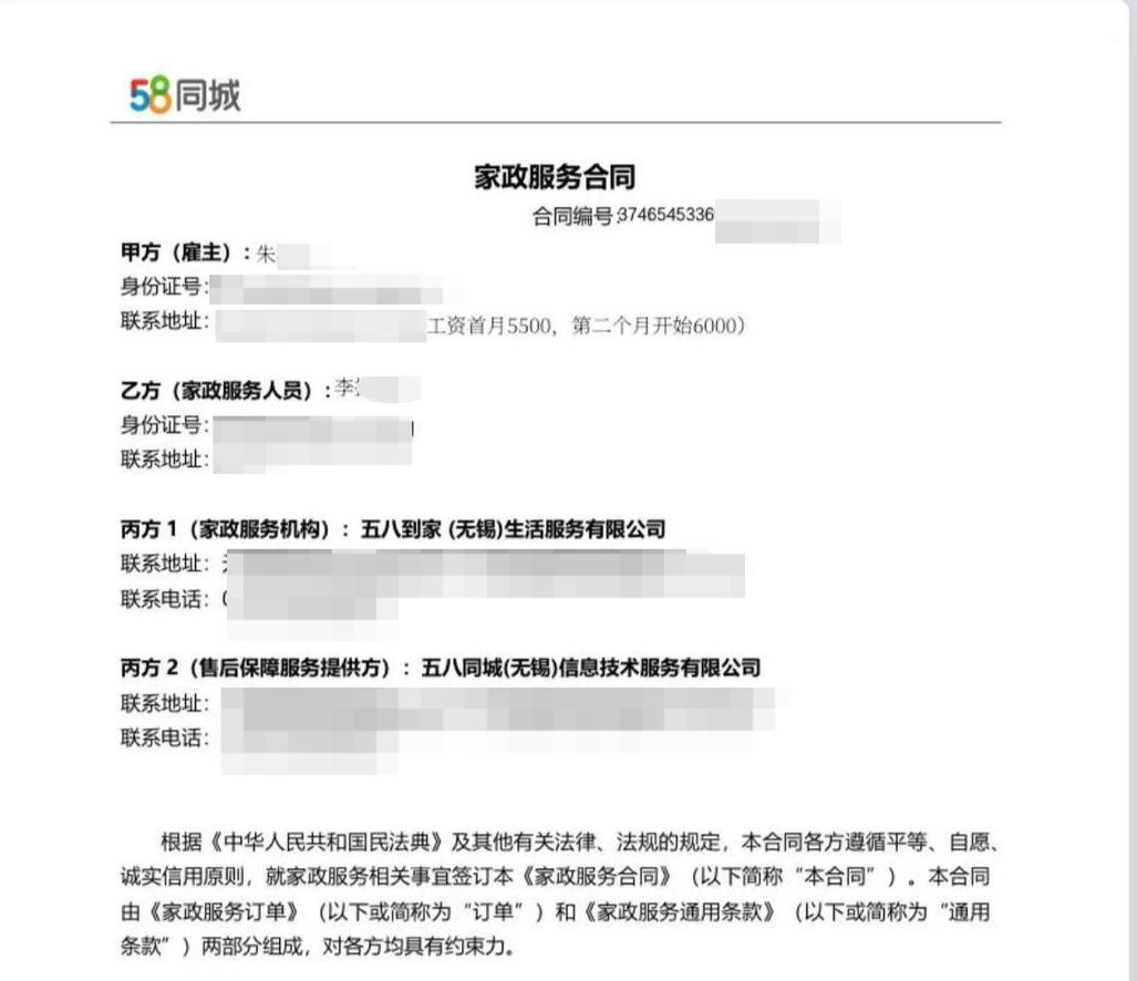 11月19日,苏州的朱先生爆料称,其62岁的母亲樊某因偏瘫失去自理能力,他于今年5月同“58到家”签订家政服务合同,58到家随后安排保姆李某某到他家。  家属提供的监控截图 朱先生与李某某和服务机构58到家签订的《家政服务合同》显示,李某某工资首月5500元,第二个月开始6000元,服务内容为做一日三餐、买菜、熨烫衣服、洗衣服、打扫卫生和照顾老人,服务期限为两年,月休四天。  合同 朱先生称,后来他们查看监控发现,仅仅在10月23日至25日几天内,李某某就存在辱骂、捆绑拖拽、用被子堵住老人口鼻等虐待老人的行为。  家属提供的监控截图 朱先生提供的警方立案告知书显示,10月27日,家属报案,10月28日,“樊某被打案”已在苏州市公安局相城分局立案调查。  立案告知书 针对李某某一事,红星新闻记者从58到家服务商了解到,目前总部平台已将李某某拉黑处理,同时平台正配合警方调查。58到家服务商工作人员介绍,李某某虐待老人属于保姆个人行为,“如果客户需要对阿姨进行法律途径处理,平台也会积极配合提供相关材料,老人出院后也会另外安排新阿姨面试。” 红星新闻记者 蔡晓仪