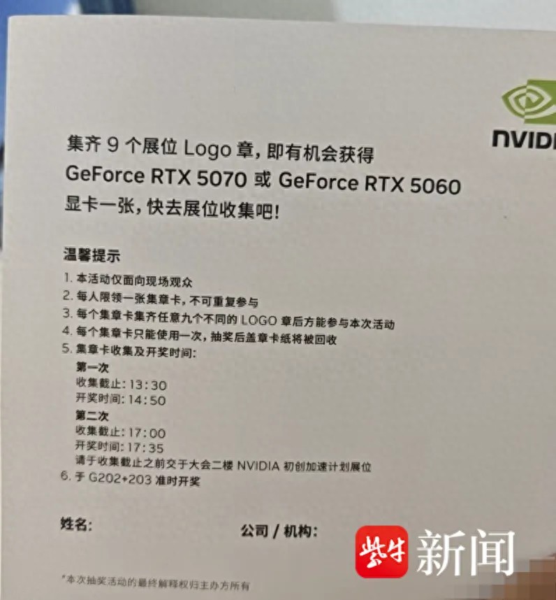 据小金介绍,他是上海某公司的实习生,8月底刚刚入职。11月14日,他受公司委派前往苏州,参加一场由英伟达(NVIDIA)主办的路演活动。当天活动现场有多家企业参与,气氛热烈,主办方开设了一个面向现场观众的集章抽奖活动。