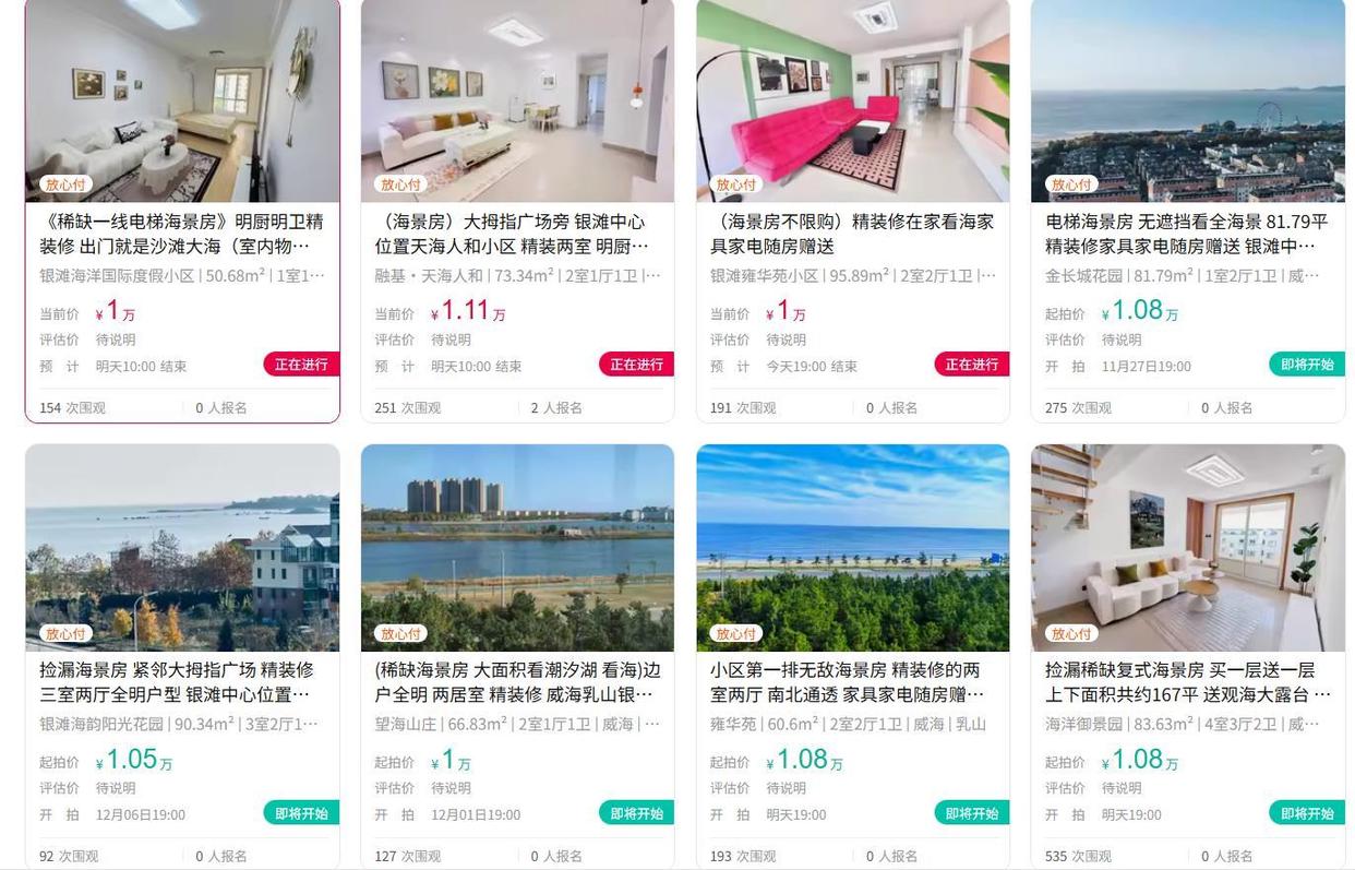 11月22日,极目新闻记者在某网络拍卖平台搜索“乳山海景房”发现,目前有多套银滩海景房正在拍卖,面积大部分为50到100平方米,起拍价为1万元左右。记者随机挑选了一套与该网友类似的房型看到,这套待拍卖的二手房户型为二居室二厅一卫,面积为60.60平方米,竞买公告显示:起拍价为10888元;保证金为12000元;加价幅度为100元或整倍。目前这套房距拍卖开始还有1天7小时左右,已吸引了195次围观,有9人设置提醒,但暂无人报名。