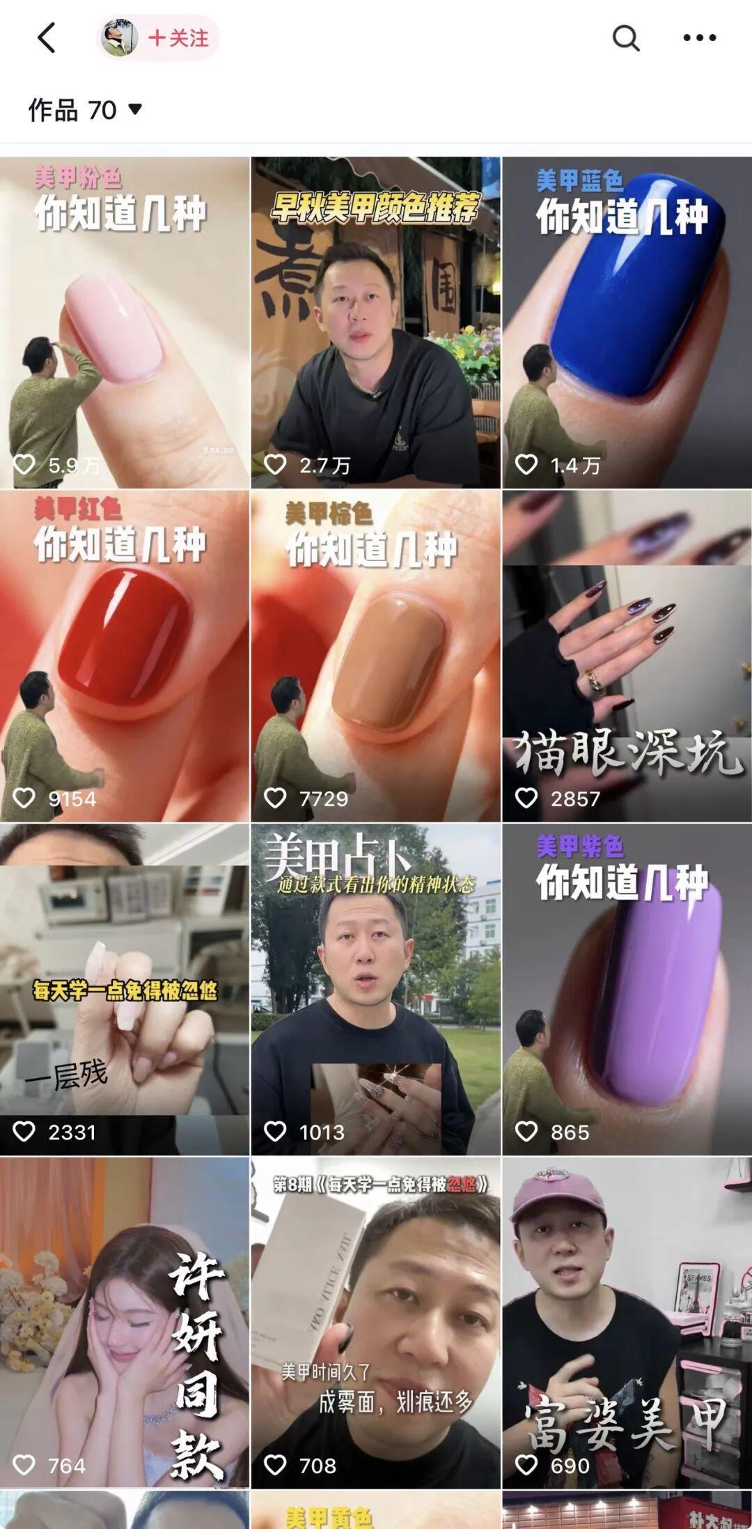 9月底至今,50多条视频让账号粉丝从500多一下涨到1.9万,连载的美甲颜色区分科普视频好几条点赞都过万。