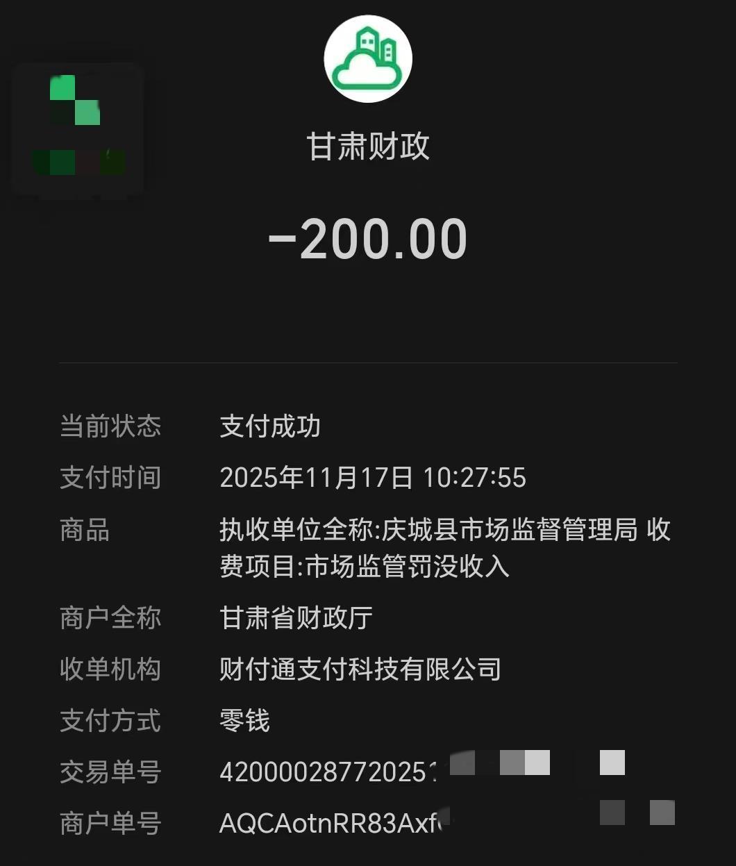 餐馆老板称,该餐馆是他今年6月新开的店,为了吸引客流,前期一直在做优惠活动,盈利不多。被“碰瓷”前,店里的生意还行,一个月能挣上万元。事发后,一些不明真相的本地食客和网友对餐馆产生误会,“他们以为是店里做的餐食不卫生,影响口碑。”他把上述监控视频发在社交平台,引发热议后视频被迫下架。当地有关方面认为是他让外地网友知道了这件事,带来了负面影响,“他们对我不满。”事发后,当地市场监管部门工作人员到店里调查“碰瓷”事件时,顺便在店里查出了与该事件无关的其他小问题,罚款200元。店方200元的支付记录显示,执收单位是庆城县市场监管局,收费项目为市场监管罚没收入。餐馆老板表示,该事件带来的压力很大,不想干了,打算转让餐馆。