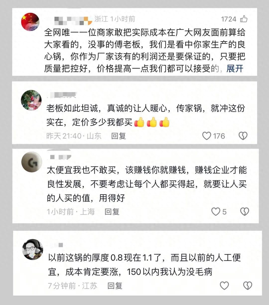 11月21日,瑞安“传家锅”主理人傅克萍向云股东们正式宣布:首批经典复刻版炒锅将于11月25日开启预售,定价99元起。 据悉,这一定价正是基于此前傅克萍公开的“阳光账本”。在相关短视频中,他将产品详细成本“摊开来讲”,把原料、包装、人工、厂房设备成本甚至税费都标得清清楚楚,“总成本90多元,售价99元,毛利不足10元……”云股东们对照“账本”一算,直呼“太良心了”。 傅克萍“公开成本”的举动,收获了云股东们的“花式护航”。