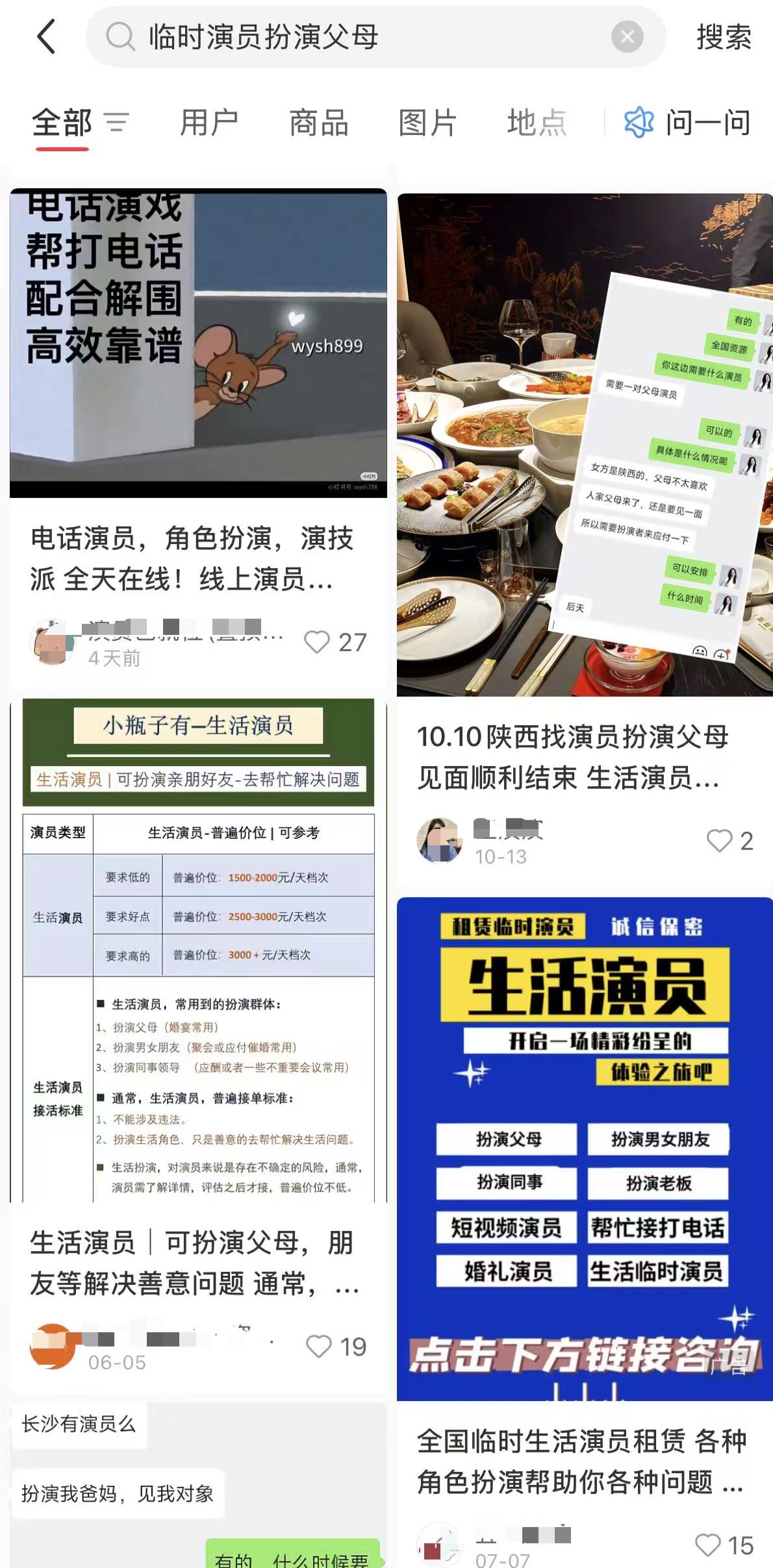 在社交平台,记者注意到,搜索“临时演员扮演父母”,出现大量帖子,不少经纪机构或者个人宣称生活临时演员,配合您演戏,可线下演戏,见对象父母等。