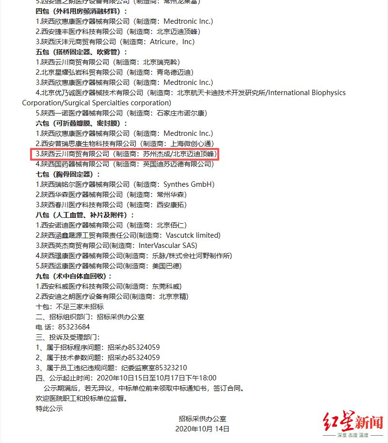 11月20日,据浪潮新闻报道,陕西西安李女士的父亲2020年在西安交通大学第一附属医院(以下简称“西交大一附院”)接受心脏瓣膜置换手术46天后离世,花费60余万元(自费32万余元)。事后李女士发现,医院为父亲做手术使用的瓣膜产品在发票上显示单价仅为3万多元,但是医院却卖给他们28万元。 26日,交大一附院就此事发布通报,称患者使用的介入人工生物心脏瓣膜及配套经心尖介入器按实际采购价28万元向患者收取费用,术前已向患者家属充分告知相关费用及治疗风险,家属签署了知情同意书。 李女士表示她无法认可医院的通报,其认为院方夸大了父亲病情,“院方所陈述的这些是否有证据材料所支撑,请让他们出示。”李女士同时提供了她起诉西交大一附院案件的二审民事裁定书,红星新闻记者看到目前该案已发回重审。 据比对招标公告等 医院所使用的心脏瓣膜集采审核价与收费价一致 在国家药品监督管理局官网,红星新闻记者查阅到李女士父亲此前做手术时使用的“介入人工生物心脏瓣膜”,制造商为苏州杰成医疗科技有限公司(以下简称苏州杰成公司)。该产品由自膨胀介入瓣膜、经心尖介入器组成。自膨胀介入瓣膜型号规格有CVM-AV 21,CVM-AV 23,CVM-AV 25,CVM-AV 27,CVM-AV 29;经心尖介入器型号规格有TA-V 21~27、TA-V 29(2025年8月1日变更为TA-V 9、TA-V 11)。 李女士此前出示了由西安市市场监管综合执法支队调取的供货商购买心脏瓣膜的发票,该发票显示陕西某商贸公司从苏州杰成公司购买了经心尖介入器型号规格:TA-V 21-27(3套);TA-V 29(4套)。自膨胀介入瓣膜型号:CVM-AV 23,CVM-AV 25(2套),CVM-AV 27,CVM-AV 29(3套)。 在西交大一附院的招标采供办公室官网上,记者查询到2020年心血管外科体外循环等耗材项目院内招标公告、招标结果公示。  2020年9月3日西交大一附院发布招标公告采购包含可折叠瓣膜、密封膜等多个耗材项目 2020年9月3日,西交大一附院发布招标公告,采购包含可折叠瓣膜、密封膜等多个耗材项目,项目编号为2020YH39。同年10月14日,西交大一附院公示此次的招标结果,显示4家制造商的可折叠瓣膜、密封膜在此次采购中标,其中就包含了苏州杰成公司。  2020年10月14日,西交大一附院公示包含了苏州杰成公司在内的4家制造商生产的可折叠瓣膜、密封膜在采购中标 而2015年原陕西省卫生计生委发布《陕西省医用耗材网上阳光采购实施方案》明确规定,全省公立医疗卫生机构必须通过采购平台采购医用耗材,采购平台为陕西省药械集中采购网。  陕西药械集中采购平台的审核结果公示 红星新闻记者在陕西省公共资源交易中心药械集中采购平台上,查询到苏州杰成公司此前中标的“主动脉介入心脏瓣膜”审核结果公示表,时间为2019年8月9日。苏州杰成公司此前中标的西交大一附院2020YH39项目,在流程上符合《陕西省医用耗材网上阳光采购实施方案》。红星新闻记者将该审核结果公示表,与李女士此前接受媒体采访时,出示的心脏瓣膜发票上的型号规格信息进行对比,发现除没有CVM-AV 21型号之外,其余型号均一致,生产厂家为苏州杰成公司。公示表内经心尖介入器、自膨胀介入瓣膜价格分别为2万元和26万元,与西交大一附院的收费价格一致。  陕西药械集中采购平台上查询到苏州杰成公司“主动脉介入心脏瓣膜”审核结果公示表 2019年12月31日,陕西省医保局发布《陕西省医疗保障局 陕西省卫生健康委 关于我省公立医疗机构取消医用耗材加成同步调整医疗服务项目价格的通知》,文件显示按照国家和陕西省医耗联动改革工作部署,取消公立医疗机构医用耗材加成,2019年年底前实现公立医疗机构医用耗材“零差率”销售,可收费医用耗材销售价格按采购价格执行。 这标志着陕西省内公立医院在药械集中采购平台上采购的医药耗材,必须按照公示价格收取,不能赚取耗材的加成费用。因此,西交大一附院采购苏州杰成公司的心脏瓣膜产品总价为28万元,李女士父亲在2020年手术时使用了这款心脏瓣膜产品后,同样被收取了28万元。 11月26日,据天眼查公开信息,红星新闻记者致电购买此次心脏瓣膜的陕西某商贸公司,显示该号码已停机。随后记者联系苏州杰成公司,工作人员告诉记者接受采访需要上级集团批准,但是其无负责采访事宜的上级集团负责人电话。 医院通报称: 所涉医保基金违规均属于“一般违规”事项 11月26日上午,西交大一附医院就此事发布通报:2020年11月12日,患者李某(男,70岁)因心脏瓣膜病、主动脉瓣狭窄、心功能二级、右椎动脉闭塞、左侧椎动脉支架术后、高血压病3级(极高危)、冠状动脉粥样硬化等多种严重疾病,入住我院心血管外科治疗。经全面评估病情后,我院于2020年11月21日为患者实施全麻下介入主动脉瓣置换术(TAVR)。术后患者出现脑梗塞、肺部感染等并发症,在我院ICU持续治疗17天后,应家属要求于2020年12月8日从我院转出。2021年1月4日,患者在外院不幸离世。患者家属对我院诊疗行为提出质疑,向相关部门申诉,并向法院提起诉讼,目前,诉讼案件正在审理中。 通报中对网传有关问题进行了核查说明,患者使用的介入人工生物心脏瓣膜及配套经心尖介入器,系该院经公开招投标程序采购的中标产品,采购价分别为26万元、2万元。该瓣膜属于医保目录外自费项目,术前已向患者家属充分告知相关费用及治疗风险,家属签署了知情同意书。2023年患者家属就瓣膜价格