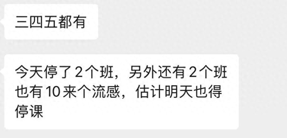 “在单位上着班呢,突然通知班级停课了。” “秋游回来就倒下了,温度都快冲到40℃了。” 这段时间,与“流感”相关的新闻频频登上热搜,这两天不少家长反映,娃所在的学校已经好几个班停课,还有老师要求学生戴着口罩上课。 “三四五(年级)都有,今天停了2个班,另外还有2个班也有10来个流感。”