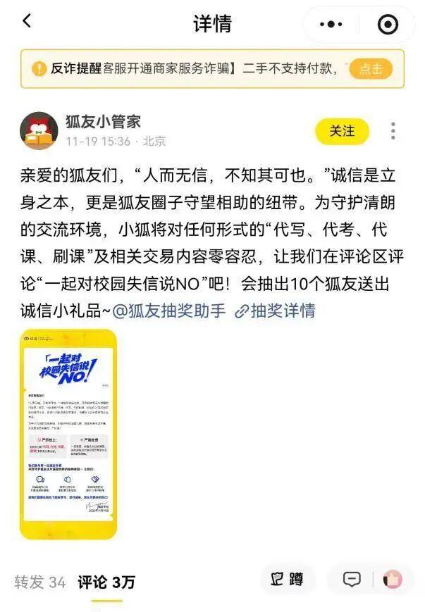 11月18日,《半月谈》发表《大学出现“专业替课”服务?是偷懒还是无奈》一文,指出“狐友”是学生发布替课交易的“主战场”。次日,作为搜狐旗下主打高校社交的产品,“狐友”发布题为《一起对校园失信说NO!》的站内信,明确表示平台对代课、代考等行为持“零容忍”态度,并宣布屏蔽相关关键词。
