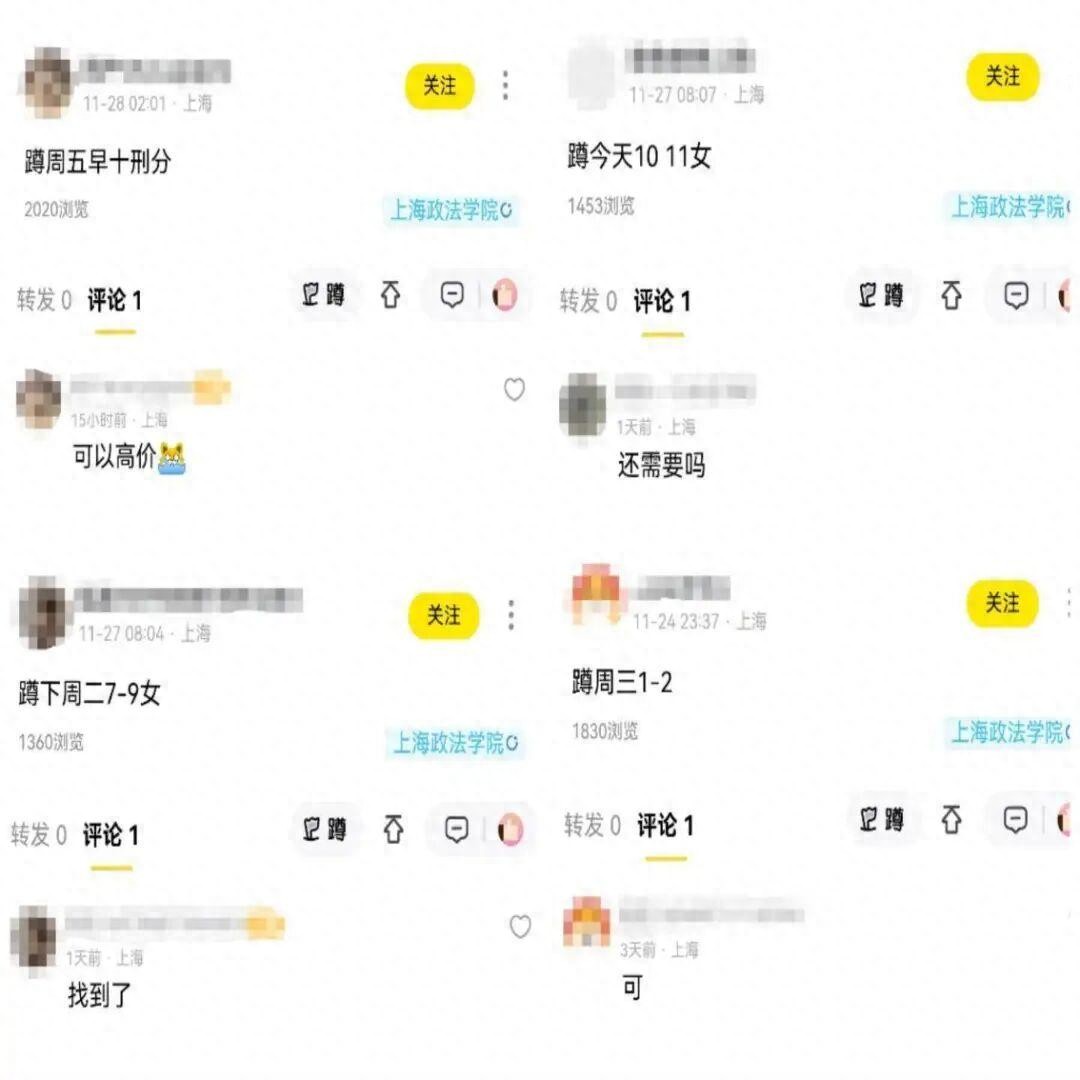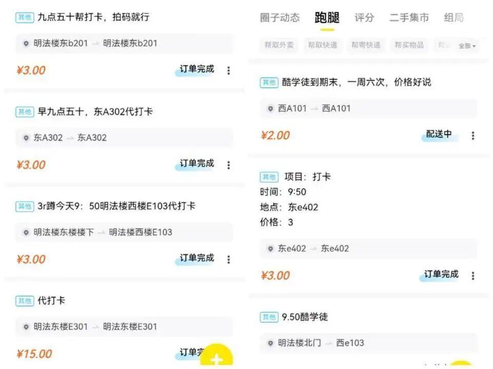 记者亲历: 20元一节课,50元一个800米及格分 自今年9月起,记者注册登入“狐友”平台,并进行了近两个月的观察后发现,上海多所高校大学生群组里充斥着“代课”“代体测”等交易信息。 一个位于外青松公路的高校学生交流群里,少则一个上午有1-2名学生寻求代课,多则一天有近10条学生寻求代课的信息,而这个群一共才有学生300余人。 图说:本文图片除特别说明外,均来源于网络公开信息 平台上,“供需两旺”。学生既可发布代课需求,也有人主动“接单”。9月24日,记者辗转联系上一名“资深”代课学生A,她已接下28日晚的一单“新闻编辑”课,并直言:“既能赚点小钱,还不耽误做自己的事,何乐不为。” 缺课学生告诉她,该课老师虽不常点名,但可能签到,“缺课三次以上会挂科”。最终双方以20元成交,对方给出的缺课理由则是“给朋友过生日”。 上课当晚,记者与代课者的出现引起了些许侧目。老师并未点名,不过意有所指地提醒:“来就是来,没来就是没来,不要做不好的事。”有意思的是,这句提醒经代课者转述后,竟换来“雇主”愿意加价的回应。课堂上,代课者始终埋头于自己的学业,仅偶尔抬头看看讲台上的老师。 课间,老师要求学生通过“学习通”APP进行定位签到。代课者顺利在教学楼内用手机登录对方账号完成打卡。有学生表示,此类签到定位精准,“必须在楼里,图书馆都不行”。 除专业课外,百人以上的公共课、通识课更是代课“重灾区”。 11月13日,记者在沪上某高校《马克思主义基本原理概论》公共课上发现,教室内有百余名学生,课堂“安静而混乱”。记者一旁的同学打开电脑、戴着耳机看电视剧《甄嬛传》,教室后排有的同学趴在桌上,还有的在吃东西……但老师全程不干涉。 进入11月高校体测季,“狐友”上“求代体测”信息激增。记者在位于海思路、龙源路与外青松公路的三所高校的群组中发现,一周内三个群里都有不少于10条公开的“悬赏代考”信息。记者实地观察了一场800米“代跑”,真实学生10分钟前刚刚在老师指引下完成其他体测项目,而代跑者身形、衣着与其差异显著。不过,当代跑者仍以第一名冲线,报出代跑学生姓名时,监考老师未表任何怀疑,记录成绩后即放行。