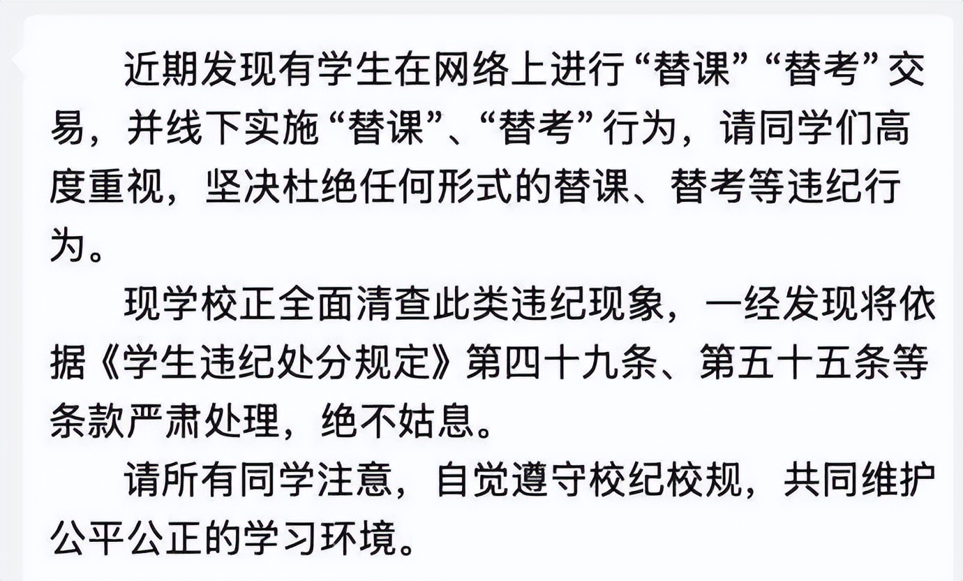 11月28日晚,某高校辅导员发布在班级群中的通知。 图源:受访者 11月28日晚,记者了解到,记者实地探访的其中一所高校已由辅导员向全体学生发布了“杜绝任何形式的替课、替考等违纪行为”的通知,并启动全面清查。该校多名学生透露,这是学校第一次正式对此类现象进行如此规模的公开管理。