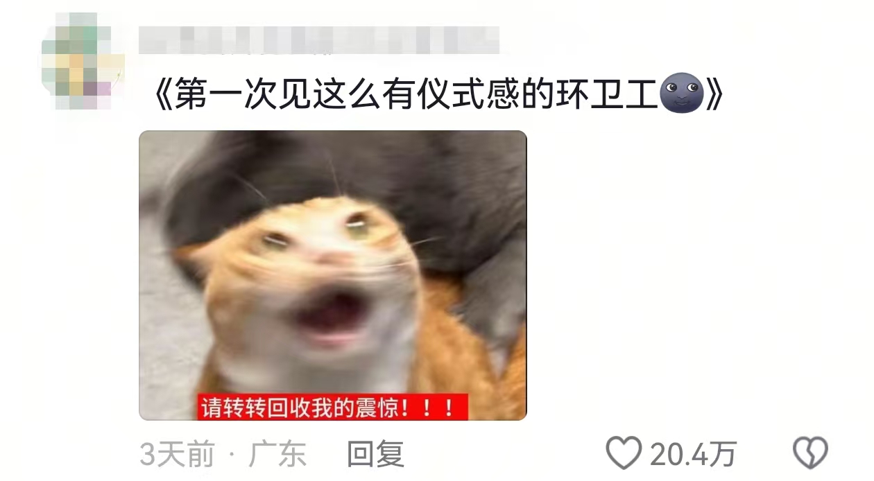 不少南昌游客将这支环保侠客天团的视频发布在网络平台,受到了网友的火热关注,评论区纷纷称赞其创意,并表示南昌“不愧是邓超诞生的地方”,也有网友表示,“第一次见这么有仪式感的环卫工”。