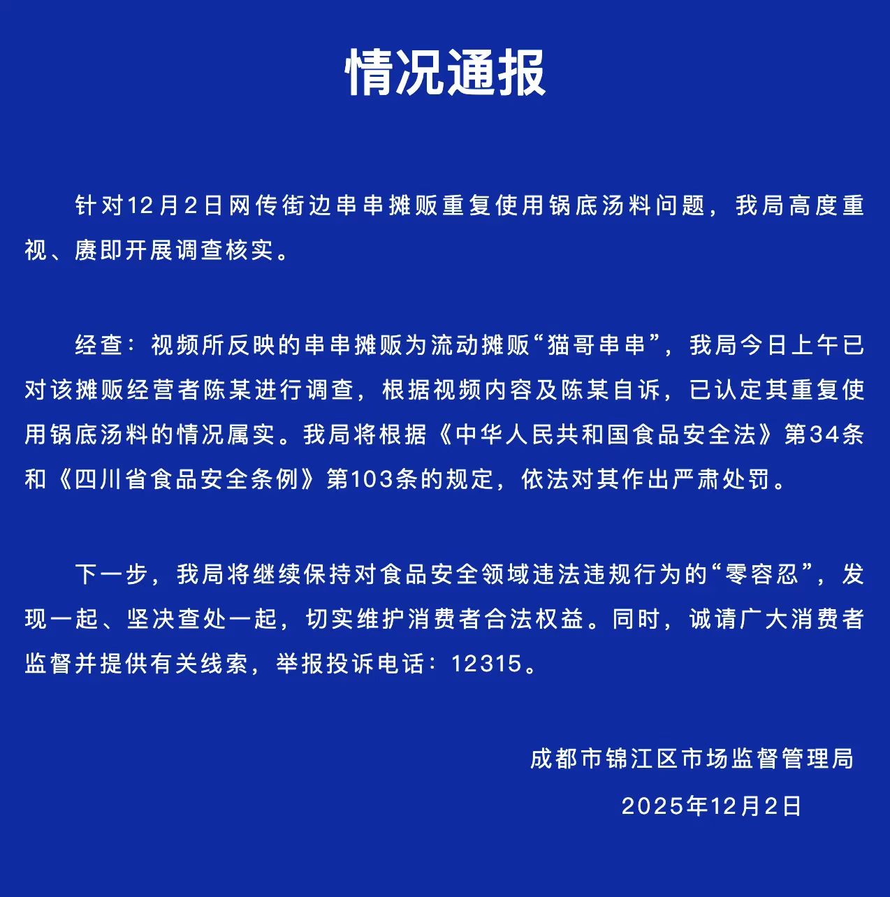 12月2日凌晨,一位网友在社交平台发布视频称,自己与朋友至成都旅游,在春熙路一家串串小摊吃饭,目睹小摊老板将其他客人吃剩的锅底倒回锅中二次使用,该网友称,“刚到成都的第一顿就被春熙路小吃街的串串地摊恶心到炸裂”。 在视频中,串串小摊老板面对网友的质疑表示,“串串都是这样。”且告知网友,“假如说今天你让我没法做生意,我叫你两个不开心,今天我就跟着你。”  网友继续留在小摊边提醒准备落座的游客,该摊位存在锅底回收二次使用的情况,小摊老板再次解释,“我做了二三十年都是这样,你们肯定是外地的不习惯,火锅串串都这样。”并称,“我这有电话,你明天两口子死了我赔你们。” 据该网友视频中的文字介绍,她已拨打12345进行投诉。 当日下午,潇湘晨报记者致电该地所属的书院街市场和质量监督管理所,接电工作人员表示已关注到上述情况,“已经在核实处理了,稍后应该会有通告发给大家。” 当日下午,成都市锦江区市场监督管理局发布情况通报如下:针对12月2日网传街边串串摊贩重复使用锅底汤料问题,我局高度重视、赓即开展调查核实。  经查:视频所反映的串串摊贩为流动摊贩“猫哥串串”,我局今日上午已对该摊贩经营者陈某进行调查,根据视频内容及陈某自诉,已认定其重复使用锅底汤料的情况属实。我局将根据《中华人民共和国食品安全法》第34条和《四川省食品安全条例》第103条的规定,依法对其作出严肃处罚。 潇湘晨报记者段颖琪