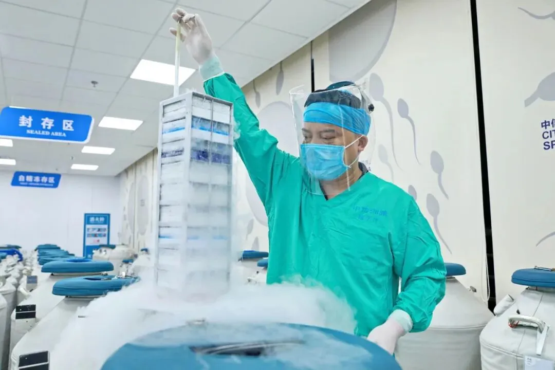 精子库工作人员正在拿取液氮罐中的精子样本/受访者供图