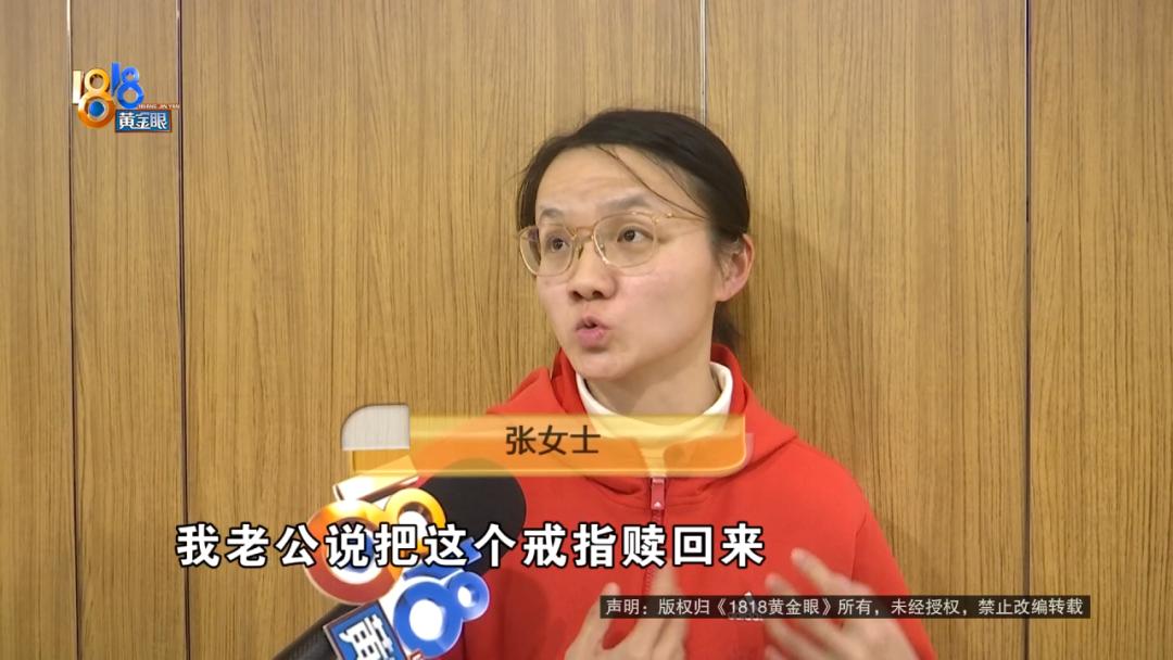 张女士:我是想着,我老公说把这个戒指赎回来,就是原价把它赎回来,你中间产生的快递费,或者是你人工费。他们说有违约金,我老公就找他要,你说你跟那个公司有违约金,那你是不是有合同?合同上面有没有写违约金是多少?他也不给我们看。他说给一千五的差价就赎回来,一下子又说卖了,现在刚刚协调又说,问我们愿意多少钱?能不能赎回来,你赎回来就是中间费用,我愿意承担。不能赎回来,那你要给我补低于的市场价,最少1000块钱。