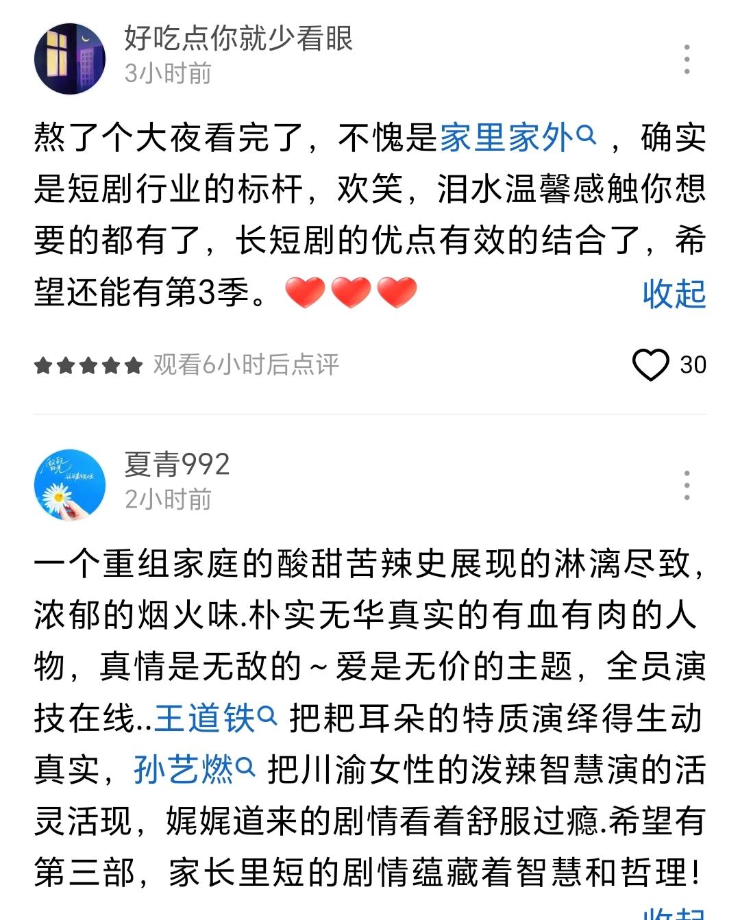 12月4日,在四川立项、成都拍摄的现象级微短剧《家里家外》续作——《家里家外2》上线,开播后迅速在网络掀起热议,#家里家外2#的相关词条登上热搜。不少观众点赞“笑中带泪”、“充满生活烟火味”,感叹“生活就是这样有苦有笑”。  新一季的故事里,陈海清和蔡晓艳一家不仅迎来了新生命,也增添了更多性格鲜明的亲戚朋友邻里,但“充满变化的年代,不变的家人和爱”这一温暖内核依然不变。 故事开篇紧接前作,从1986年蔡晓艳的“艳艳家电行”开业讲起。开业当天喜事临门又麻烦不断:蔡晓艳身怀六甲,“恶婆婆”吴翠芳假意探望,欲索要冰箱。小心思被戳穿后,吴翠芳装晕耍赖,泼辣的蔡晓艳以其人之道还治其人之身,也“痛”呼起来。爱妻护家的陈海清带着两个孩子同仇敌忾,连吓带哄终于送走了这位不速之客。  吴翠芳一走,蔡晓艳突感腹痛难忍,家人起初以为她仍在“演戏”,不料的确是羊水已破!陈海清慌忙用三轮车送妻就医,在颠簸下,孩子呱呱坠地!一家人在兵荒马乱中迎来了新成员。  经历上一季,“耙耳朵”陈海清的宠妻本色有增无减。而“高坪区第一歪婆娘”蔡晓艳依旧犀利。面对新邻居拐弯抹角指责孩子不懂分享,她直接夺过对方金戒指说:“你不愿分享你的,娃儿也不愿分享他的!”噎得对方哑口无言。陈海清更是霸气护妻宣言:“我们是为了让娃儿些过得更好!”这句话,也点明了本季的深层主题——无论外部世界如何风雨变幻,家人之间那份无条件的偏爱,永远是抵御风浪最坚实的港湾。  剧集播出后,观众反响热烈。众多网友留言表示,该剧精准捕捉了平凡生活的酸甜苦辣,既有鸡飞狗跳的闹腾,也有苦尽甘来的欢笑,“是让人边看边笑、笑中带泪的好作品”。 据悉,相较于第一部,《家里家外2》在人物刻画上更为丰富立体,新增了十多位各具特色的角色:如热情爽朗又有学识的四川嬢嬢李老师,从北京来川生活的单纯热心小伙周大为,善良且气场强大的谢桂枝等,为这个家庭的故事增添了更广阔的邻里社会背景和人情味。  孙艺燃与王道铁两位主演表示,新一季中,他们完成了从“年轻父母”到“中年父母”的蜕变。 王道铁认为,经历了更多家庭琐事、孩子成长和重大人生抉择,陈海清在第二部中显得更加沉稳可靠。孙艺燃则解读道,这种变化不仅是年龄的增长,更是心境的沉淀:“第一部更多展现的是刚结婚时的年轻气盛和冲劲,现在步入稳定期,看着孩子们一天天长大,经历和体会到的生活滋味更复杂深厚,感觉自己也在和角色一同成长。”  值得一提的是,该剧一共111集,每集时长从2分多到5分多不等,总时长超过4个小时,已经超过大部分总长100多分钟的微短剧。该剧出品方听花岛相关负责人告诉红星新闻记者,此次《家里家外2》在长度上做了一次创新和挑战。当下的微短剧正在升级,所谓的短,并不是长度上的短,而是浓缩、脱水和倍速。短,是指高密度,要在情绪密度、信息密度、情节密度上做到高浓缩,观众才愿意看。 红星新闻记者 邱峻峰 编辑 苏静