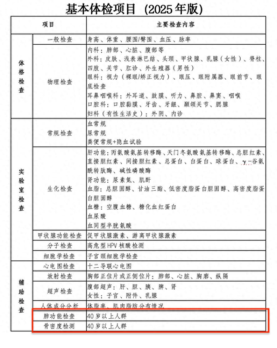别慌,国家卫健委不久前发布了《成人健康体检项目推荐指引(2025年版)》,明确推荐了40岁以上必做的两项检查。这两项就是——肺功能检查、骨密度检查。