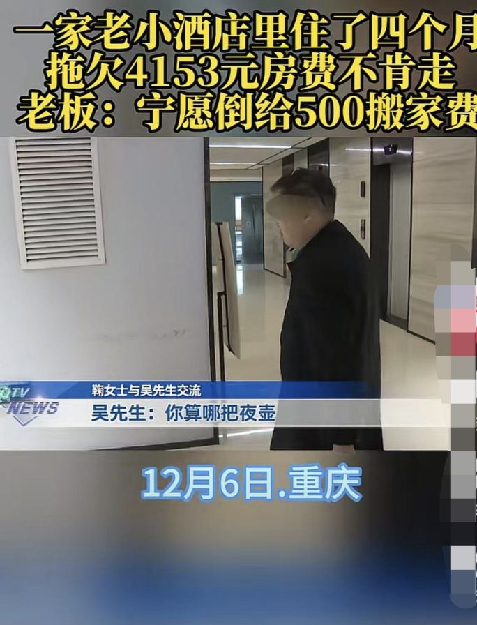 近日,一家人拖欠重庆一酒店4153元房费,老板称愿倒贴500元搬家费,这家人还不肯走的事件引发关注。12月7日,酒店老板在腾讯新闻“热问”发声讲述了此事。 7日,潇湘晨报记者联系到该酒店老板鞠女士,她告诉记者,此事在网上传播后,这家人已开始搬离,她也按承诺倒贴了这家人500元。  鞠女士介绍,欠租的这一家人住的是LOFT房型,今年7月底入住,从10月起多次拖欠房费,目前累计欠费4153元。他们进行过多次催缴,但吴先生一家三辈仍拒绝搬离,并在没水没电情况下继续居住。 “让我很生气的是,我跟他们说,你们有困难,应该去找有关部门,如果符合标准,可以去申请公租房,去申请低保。他们竟然说:‘扯哟,我怎么能去住公租房啊?’”鞠女士说,双方因房费的问题都报过警,因此事对酒店生意已造成影响,她愿意将这家人的所有欠费都免了,且还愿意倒贴500元钱。 鞠女士说,此事经媒体报道,这家人也开始搬走了。“采访后他们就开始收拾东西了,昨天播了后就搬东西了,人也走了,昨天晚上也没住在这里了。” 对于她此前表示愿意倒贴500元的说法,鞠女士表示,她按承诺倒贴了这家人500元。“人都有困难,确实有困难,有困难又是个老赖。” 此前,据重庆电视台《天天630》栏目报道,拖欠房费的吴先生表示,他们在该酒店居住是因为离法院较近,近几个月他在处理一个案子,因官司涉及到的赔偿一直未下来,所以没钱交房租。对于拖欠酒店的房费,吴先生则称这属于经济纠纷,酒店可去法院起诉。  潇湘晨报记者武华康