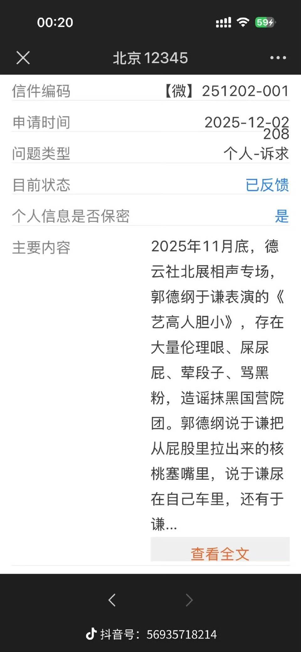 极目新闻记者 张聪 12月7日晚,相声演员郭德纲“被约谈”的消息在网络不胫而走。极目新闻记者注意到,一篇由个人微信公众号“起社”发布的《郭德纲被约谈》文章提到:“北京市西城区文旅局已于2025年12月5日正式约谈德云社,认定郭德纲、于谦在北展剧场表演的相声《艺高人胆小》存在低俗内容和不当影射国有院团行为,要求立即整改。”  此外,网络上还有两张截图流传甚广。一张为网友12月2日提交给北京12345的投诉截图,图中投诉内容为:“2025年11月底,德云社北展相声专场,郭德纲于谦表演的《艺高人胆小》,存在大量伦理哏、屎尿屁、荤段子、骂黑粉,造谣抹黑国营院团(等台词)。”  另一张开头标注为“西城区分中心回复反馈”的北京12345回复系统截图被网友贴上了“郭德纲被北京西城文旅严肃批评”的红字。图片显示,回复反馈于12月4日发送,其反馈内容包括:“表演过程中演员使用砸挂、谐音梗等方式,有些涉嫌存在低俗、不雅的现象,我局对演出对象进行了严肃的批评教育。”  同时提到:“我局就相关问题正式约谈了主办方和演出方,要求立即整改,对演出台本进行重新编排,之前容易产生负面舆论的台词不得再次使用……” 郭德纲于谦演出遭投诉 33分钟的《艺高人胆小》到底说了什么 引发网友投诉的《艺高人胆小》里,到底说了些什么? 2025年11月26日,德云社在北京北展剧场举办《四海福临-2025德云社郭德纲 于谦相声专场》。极目新闻记者搜索发现,一段时长为33分28秒的视频完整记录了《艺高人胆小》的演出内容。在观看后记者发现,《艺高人胆小》中被网友投诉的点位,大都有着相声表演的艺术特点,比如涉及谐音梗的“小姐”(其实是说理发师“小杰”)、“畜类”(郭德纲在讽刺三十年前曲艺团体怪现状时对艺术处、演出处、业务处的统称),被网友怒斥为“屎尿屁”“伦理哏”的,多为郭德纲对于谦刮脸、于谦醉酒、把于谦和郭麒麟相提并论等创作调侃等。  这中间,被网友投诉为“造谣抹黑国营院团”的段落大约为10分钟,是郭德纲对“三十年前曲艺团体”内一些怪现状的个人讽刺—— 比如风气不正,“现在相声界好多了,三十年前……我说过这么一句话,如果好人是云彩,坏人是星星的话,那相声界就是‘万里无云、星光灿烂’。” 比如好逞口舌之快,“那会儿吃饭就盼着跟团里出去慰问去,但有时候也不行,团长吃得好,演员吃得差……团长点菜,先点凉菜,来个‘勾勾搭搭’!‘勾勾搭搭’什么菜?黄豆芽炒绿豆芽!对,喜欢勾勾搭搭。再来个‘悄悄话’,什么是‘悄悄话’?猪耳朵拌猪舌头!……再上热菜,来个‘一丝不挂’,什么?烧鸡啊!川菜有没有?给我来一个‘红灯区’!什么‘红灯区’?重庆辣子鸡!” 比如外行指导内行,“团里一开会可热闹了,团长坐这儿,副团长坐一排、业务主任坐一排、艺术评论家坐一排、艺术理论家坐一排、演员四个。就4个?旁边坐着我们团唯一的艺术家,撒酒疯倒像个演员的样儿。” 此外,“强行慰问演出”“匿名诬告大奖赛”等表述,也引发了全场的笑声。 针对“约谈”传言网友反映不一 北京市西城区文旅局:具体回复要等领导调度 网传“被约谈”截图是否属实?极目新闻记者注意到,11月7日11:41,IP地址显示为江苏的郭德纲发布微博,提到“昨晚(6日)无锡演出,人心雅静,素质极高。”似是回应传言。  而在网上,对于郭德纲“被约谈”一事,网友意见不一。有网友赞成“娱乐须有尺度,表演要有边界”,但更多人也表达了不同意见。 比如微博大V“张洲”就直言“痛失巨梗,今后无矣”,大V“诗人老王”在评论中留言“此处可发一叹”。不少讨论被约谈一事的微博中,有网友感叹“这样下去相声‘完了’”,还有人不解:“讽刺不就是相声的核心功能吗?况且这是剧场演出,说的还是三十年前,是谁上赶着对号入座了?”  同时极目新闻记者注意到,有观众提到,《艺高人胆小》并不是新段子,“这都是演过多少场的老段子了,至于吗?” 12月8日上午,极目新闻记者拨打郭德纲经纪人王海电话,未获接听。 8日上午9时,记者联系北京市西城区文旅局,求证“约谈事件”的真实性,同时询问文旅局要求德云社整改与调整台本的具体依据。9:09,工作人员回复电话提到,采访需要记者先联系西城区区委宣传部,获得授权,至于网传截图是否为真,“这个我们暂时没办法做出回复”。 9:10,西城区区委宣传部接听记者电话后表示,西城区文旅局有新闻发言人,可以对外进行新闻发布。 在宣传部和文旅局沟通后,11:00,西城区区委宣传部向记者来电,表示区文旅局对记者的问题有相关业务回答,可以随后联系。 11:03,记者再度拨打北京市西城区文旅局办公室电话,对方提到,具体情况还要等“领导调度”,“这些信息我还没有办法跟您说”。 至极目新闻记者截稿时止,北京市西城区文旅局尚未给出事件的相关回复。 (图片均来自微博截图) (来源:极目新闻)