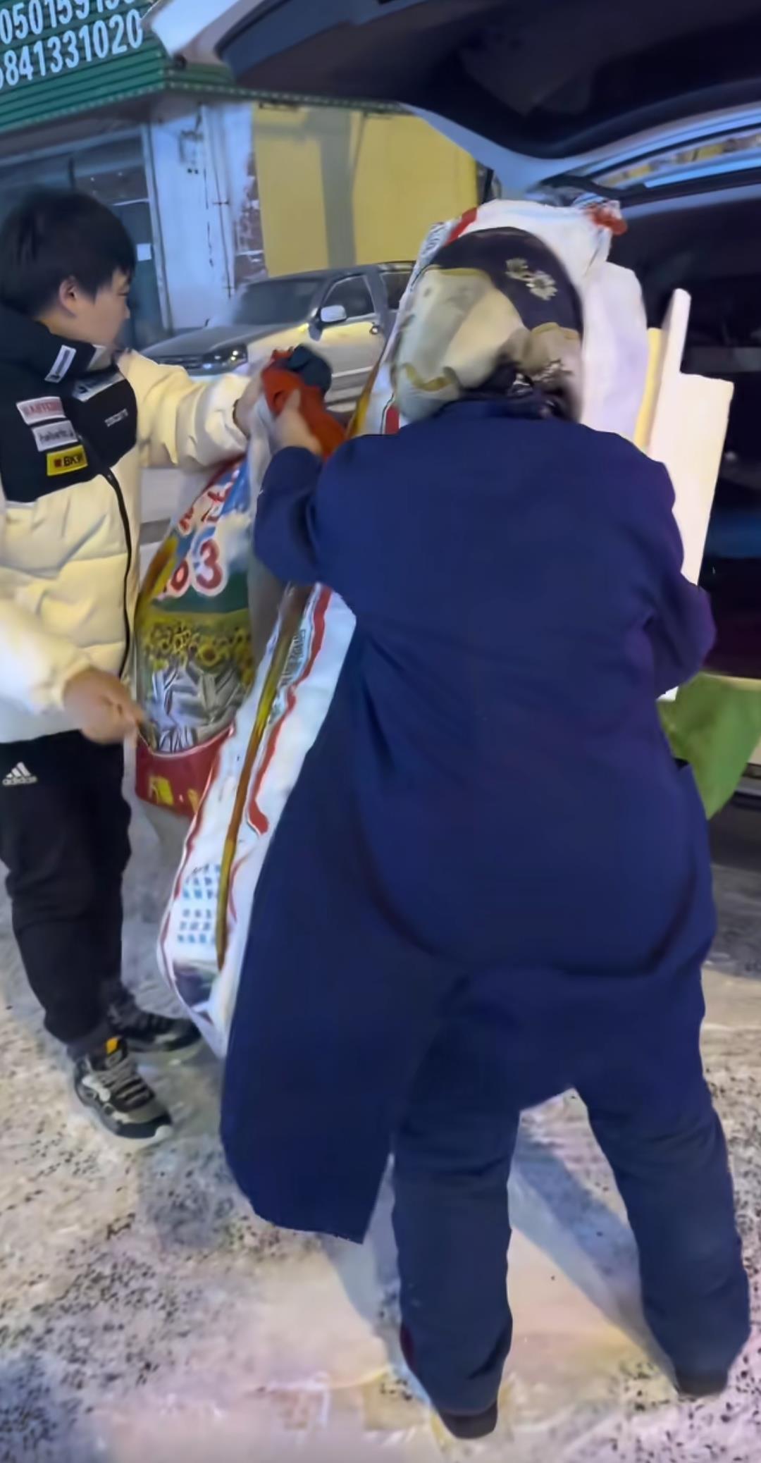 网友拍摄的视频显示,夜晚的街头下着大雪,一位老人独自在路边的人行道上行走,她身披一块蓝色塑料布,手中提着**袋和包裹。一名男子将车停在路边,上前询问后接过老人手中的物品放在汽车后备箱,并邀请老人上车将其送回家。极目新闻记者注意到,这样的暖心事发生在辽宁抚顺市。