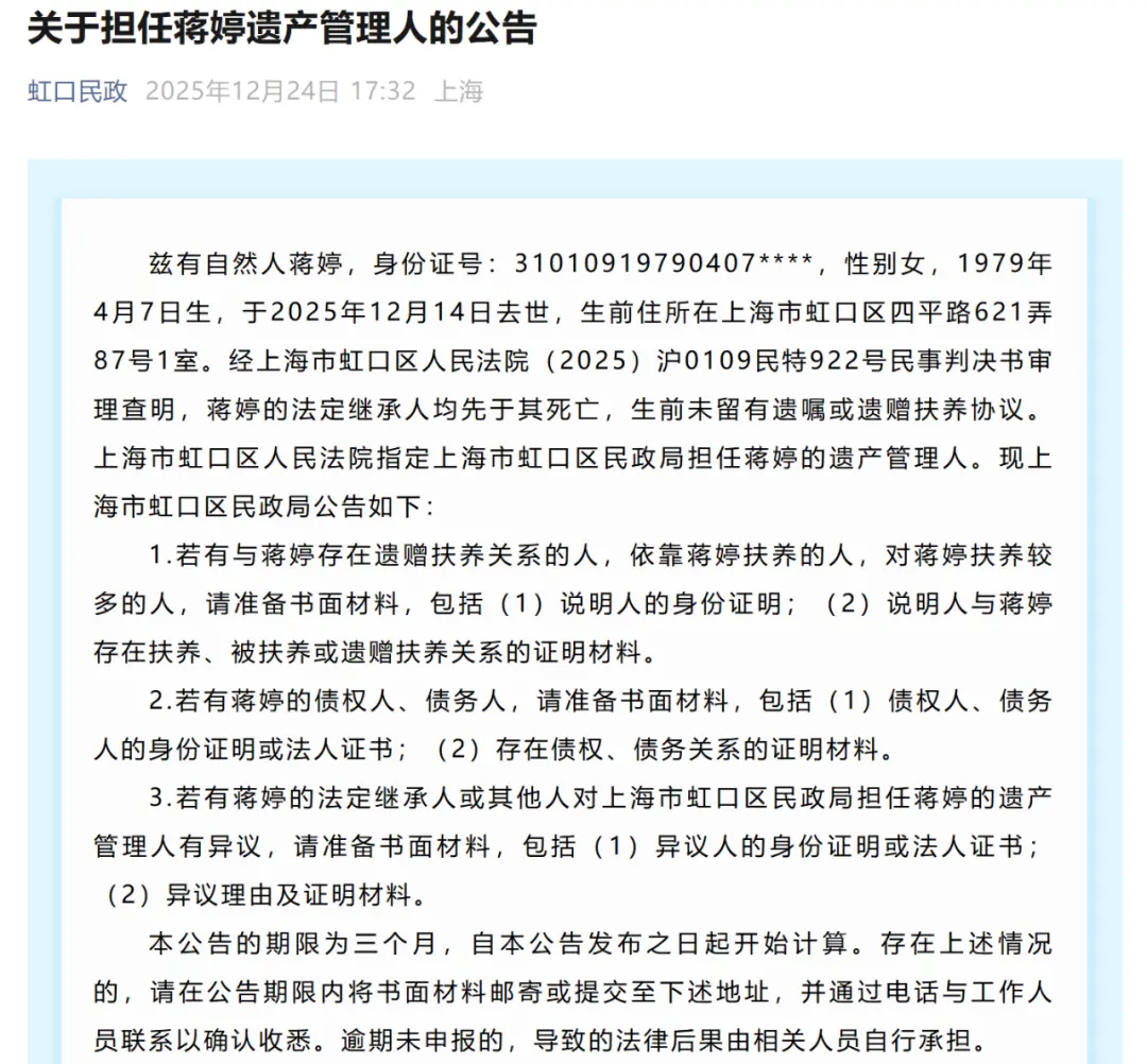 据虹口区民政局最新发布的《关于担任蒋婷遗产管理人的公告》,蒋婷生前住所位于上海市虹口区四平路621弄,法定继承人均先于她去世,且她生前未留有遗嘱或遗赠扶养协议。