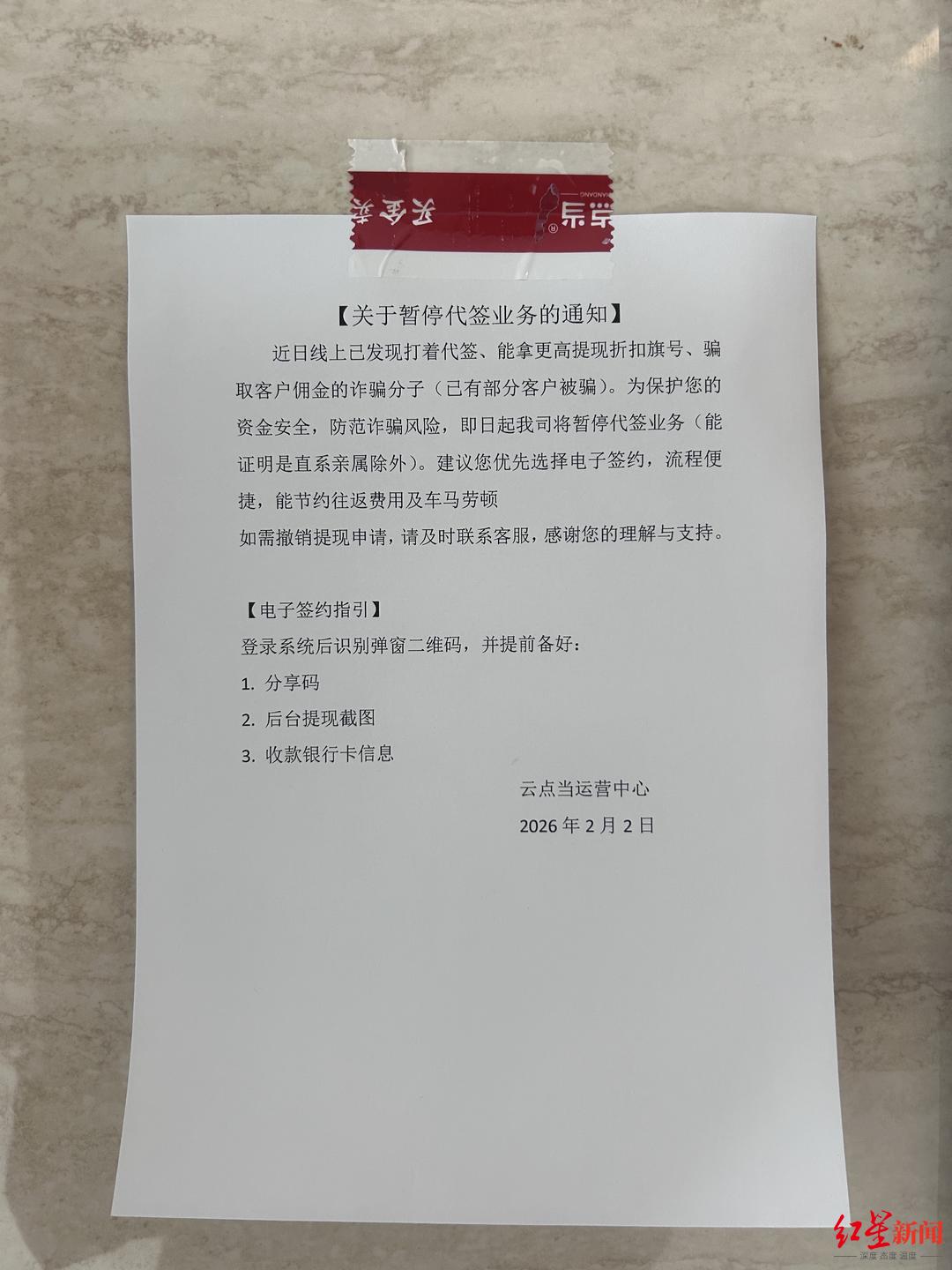“受行业恐慌影响,最近遭3波严重挤兑。”2月1日,深圳水贝一家黄金回收平台“云点当”在公告中称。 近日,国内外贵金属价格波动剧烈,市场不确定性显著增强。红星新闻记者获悉,“云点当”连日遭遇挤兑,1月31日至今,有用户从贵州、江西等地驱车千里赶至水贝市场该平台的办公地点要求提现。2月2日,红星新闻记者在现场看到,仍有十几人在等待兑付。“云点当”现场工作人员解释,公司在“杰我睿”等平台上有对冲操作,受此影响,公司目前出现较大的现金缺口。 1月中下旬,一家名为“杰我睿”的黄金料商因经营异常“暴雷”,成为行业关注重点。随后,深圳罗湖组建工作专班,督促杰我睿公司处置资产、筹集资金,目前已启动兑付。 目前,“云点当”给出了“分期全额兑付、一次性4折兑付及等待恢复后兑付”这3种方案。用户陷入“赌未来”还是“忍痛割肉”的两难抉择。  “云点当”公告 一黄金回收平台称“遭3波严重挤兑” 已给出3种兑付方案 2月1日,黄金回收平台“云点当”发布公告称:“受行业恐慌影响,最近遭3波严重挤兑,逼得我们不得不出一个个新公告,客服疲于应对各种这样的杂事、直播因线下杂事太多,这几天一直不正常,实在表示抱歉!但请大家放心,我们一直都在,公司从上到下所有同事全力在面对问题、解决问题。” 该公告中,“云点当”向用户提供了3种最新的兑付协商方案,从2026年2月1日开始执行:A方案不分金额大小,分6个月付,100%兑付(每月5号前付1/6);B方案不区分金额大小,一次性付40%,3个工作日内付清;C方案不参加挤兑,等一两个月后平台恢复正常,随时100%兑付(不用签任何协议)。 “这意味着,选择A方案就要赌,B方案就要立刻损失60%。”一名使用“云点当”一年多的用户告诉红星新闻记者,目前“云点当”平台原有小程序已无法打开,启用了临时连接,账面余额提现提不了,黄金存料也无法正常提出。  “云点当”启动临时链接 “云点当”主体为深圳市云点当网络科技有限公司。其平台网页显示,其为全国连锁的“寄卖+互联网”云平台,线上和线下相结合,服务范围包括黄金、钻石、名表、名包、名酒、汽车等的回收、寄卖、代购、鉴定、养护。 “云点当”用户李先生告诉红星新闻记者,截至2月2日,他于1月26日在平台上的提料到现在还未发货。有的用户等待时间更久,1月24日的申请仍在流程中。 “1月28日,我寄出去金料准备给平台回收,但不久我就发现打不开小程序了,幸好迅速点了拦截物流。”李先生称,此后有多名用户反映,“云点当”客服开始不回信息,电话也不通。 1月31日,包括李先生在内的多名用户赶到“云点当”位于水贝万山珠宝园的办公地点,要求提现。当天,“云点当”发布的公告称,“近期,受行业个别平台风险事件波及,导致我司资金流动性出现一定的挤兑。我司对某两家公司的相关款项,目前回收困难。尽管短期内回收希望渺茫,但我们已将该债权情况向政府相关部门完成报备,并保留一切法律追索权利。” 面对来现场兑付的用户,现场工作人员解释,公司在“杰我睿”等平台上有对冲操作,受此影响,公司目前出现较大的现金缺口。  “云点当”广告语 “云点当”方面表示,由于银行卡风控严格,每天将设定兑付额度,将优先转账已签订《和解协议》的提现。同时,公告中提供了一个二维码,支持在线电子签约《和解协议》。“云点当和解协议电子签”的签署链接显示,发起方为深圳市云点当网络科技有限公司,参与方为深圳市云点当网络科技有限公司、深圳市麦多金珠宝有限公司。 面对当前波动的黄金市场,李先生称,后悔没有更早跑,他在1月31日选择与平台签署了和解协议。近一年多来,由于信任平台,他陆续共投资了近10万元,目前账面上仍有近4万元未提现。 考虑之下,他选择A方案全额分期6个月兑付,1月31日他拿回了第一笔资金,2月2日又拿了第二笔,共计约1.3万元,“目前相当于打了3折,剩下4笔后面的4个月能不能拿到,就当赌未来了。” 平台暂停代签业务: 有诈骗分子趁机骗取外地用户代签费,已报警 2月2日,红星新闻记者以用户身份来到“云点当”公司现场,发现公司电梯口、大门、走廊均张贴了多张公告,其中“关于电子签约和兑付的公告”称,近期因集中挤兑,账户被银行暂时冻结,导致兑付暂缓,我司在与银行积极解决。 在现场,多名来自贵州、江西的用户在排队与平台方代理律师商谈协议事宜。其中一名头发微白、年纪较大的中老年女性用户眼眶泛红,她介绍,她是瞒着家里人连夜坐了近千里的动车赶来的,“家里人不同意我在网上搞这些,我上周才入,不到几天就取不出来了。”对于和解协议给出的方案,她和大部分用户一样犹豫不定。 此外,门口还新张贴了一张就谣言报案公示和《关于暂停代签业务的通知》。现场工作人员介绍,近日公司发现,连遭挤兑后,一些外地用户来不到深圳,线上趁乱出现了一些打着代签协议、能拿更高提现折扣旗号、骗取客户佣金的诈骗分子(已有部分客户被骗),对于此类现象,平台已经作报警处理。  “云点当”公告 “为保护资金安全,防范诈骗风险,即日起我司将暂停代签业务(能证明是直系亲属除外)。”公告建议,用户可优先选择电子签约,流程便捷,能节约往返费用及车马劳顿。在该平台对外公布的期限中,“最快一周,最慢一个月,我们将全面恢复正常运营。” “银行资