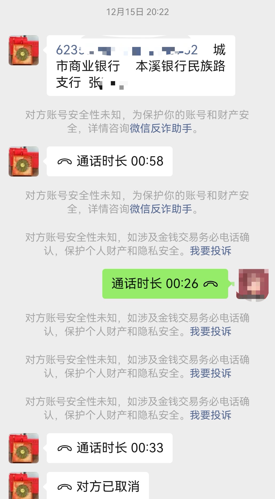 聊天记录曾多次弹出反诈提醒 “我莫名成了电诈的一环” 华商报大风新闻记者注意到,12月14日晚8时27分,李先生向“小友药材铺”发送银行账户、开户行信息等,未收到“反诈”提醒。12月15日晚8时,在退还10万元时,“小友药材铺”发来了银行账户等信息,微信多次提示“对方账户安全性未知,为保护你的账户和财产安全,详情咨询微信反诈助手”。