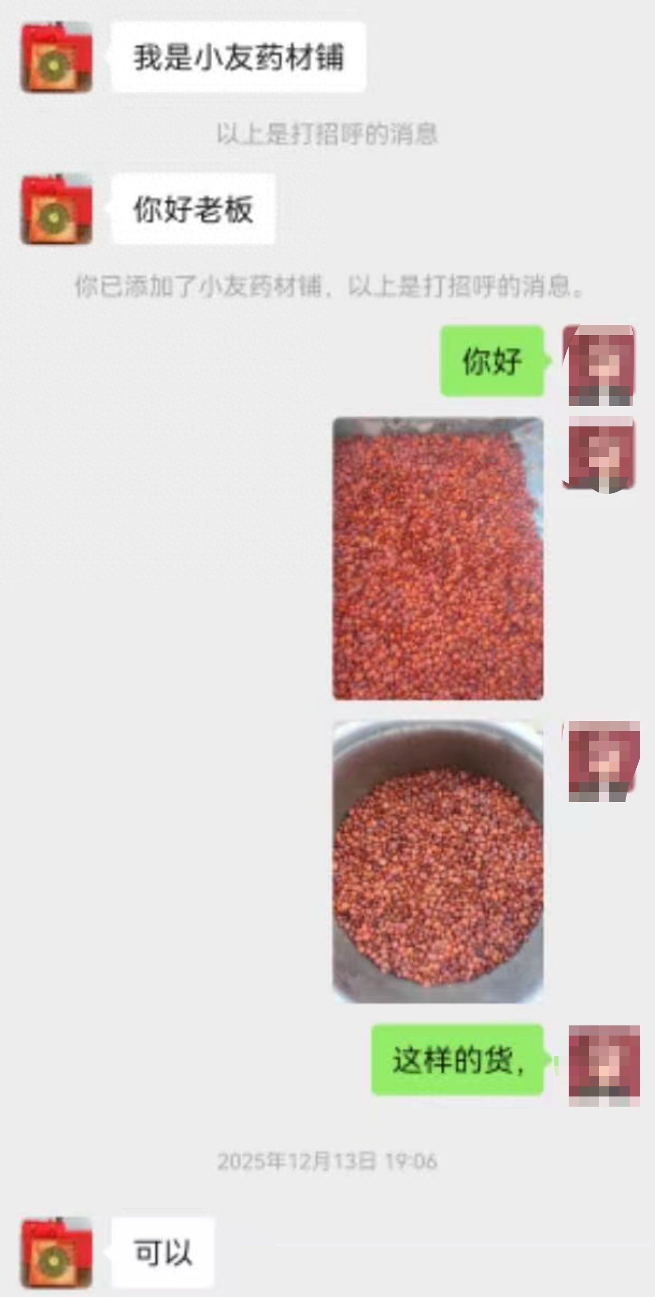 陌生男子来电称要1.25吨酸枣仁 1994年的李先生是陕西蒲城人,从事购销中药材工作已经七八年时间,常年从药农手上收购加工的成品酸枣仁、黄芩、柴胡等中草药,然后批发出售给药商。 李先生说,近两年,中草药购销的生意不太好,为了打开销路,他在短视频平台发视频自我推广,并在自我介绍处留下了联系方式。 2025年12月13日下午,李先生收到了河南商丘一男子的电话,“他自称通过短视频平台联系到我,是某药厂的合伙人,需要1.25吨的酸枣仁。” 添加对方微信“小友药材铺”后,李先生向对方提供了视频等,对方觉得质量可以,决定按照每公斤280元收购,“这是目前的行情价。”