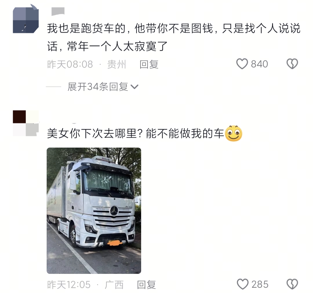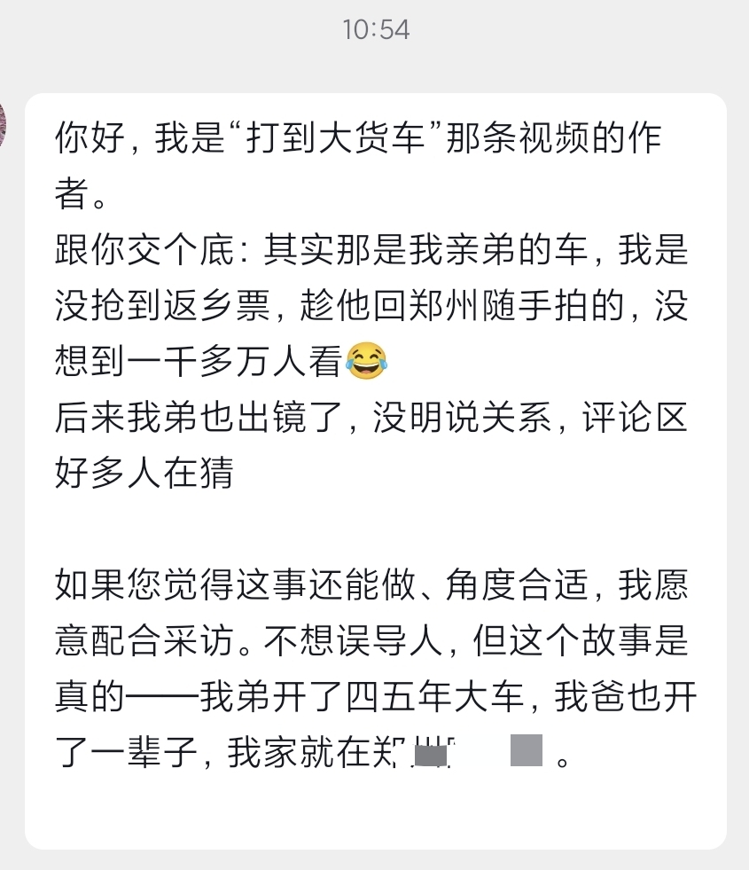 2月10日,一段仅7秒的短视频在春运路上意外刷屏,播放量破1200万、点赞超7.9万。视频里,一辆崭新的大货车缓缓驶来,成为王女士从上海回郑州的最特别的春运座驾,不少货车司机感慨:“他带你不是图钱,只是想找个人说说话,常年一个人跑大车太孤单了。”