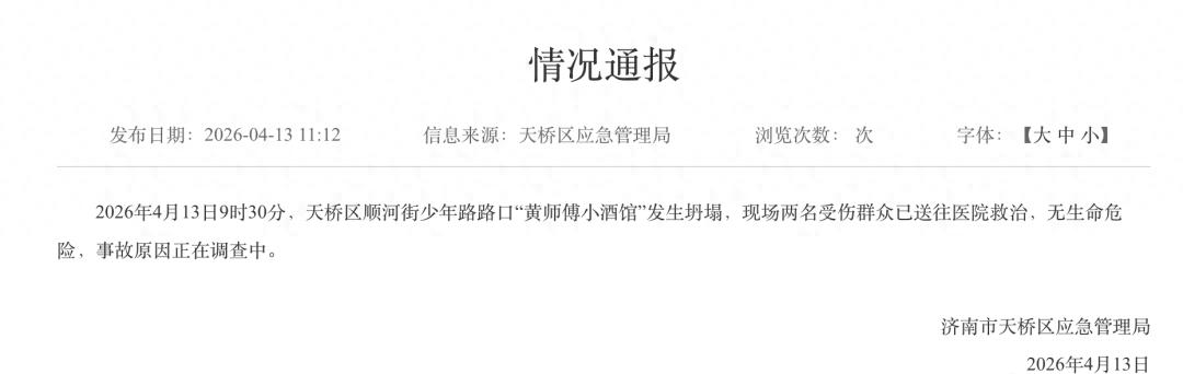 2026年4月13日9时30分,天桥区顺河街少年路路口“黄师傅小酒馆”发生坍塌,现场两名受伤群众已送往医院救治,无生命危险,事故原因正在调查中。