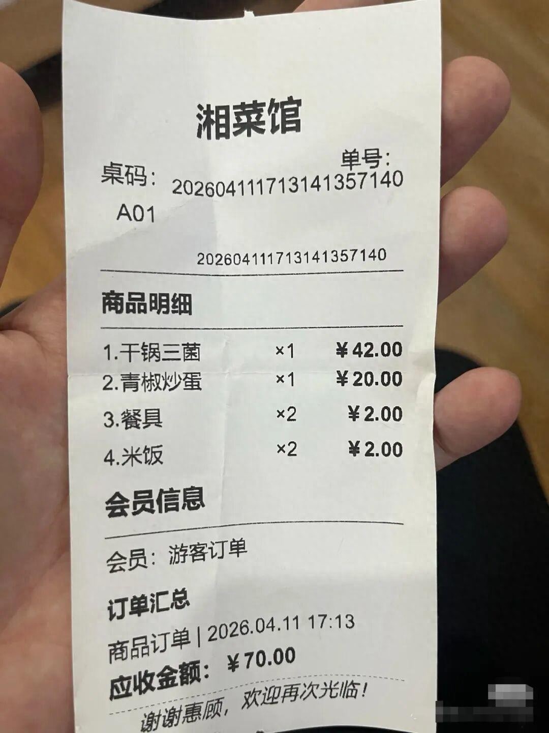 据网友爆料,其一行在该店点单时,参照店内过塑纸质菜单消费,其中砂锅三菌标价32元、青椒炒蛋标价18元。结账时小票显示,菜品名称变更为干锅三菌,售价42元,青椒炒蛋售价20元,两道菜合计多收12元,订单标注为游客订单。